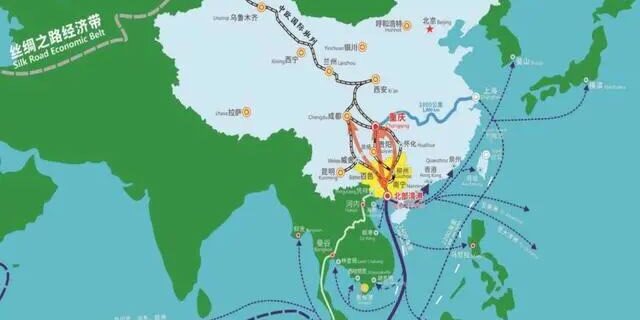 เส้นทางจากเขตเศรษฐกิจฉงชิ่ง ผ่านกุ้ยหยาง และหนานหนิง ไปออกปากอ่าวเป่ยปู้