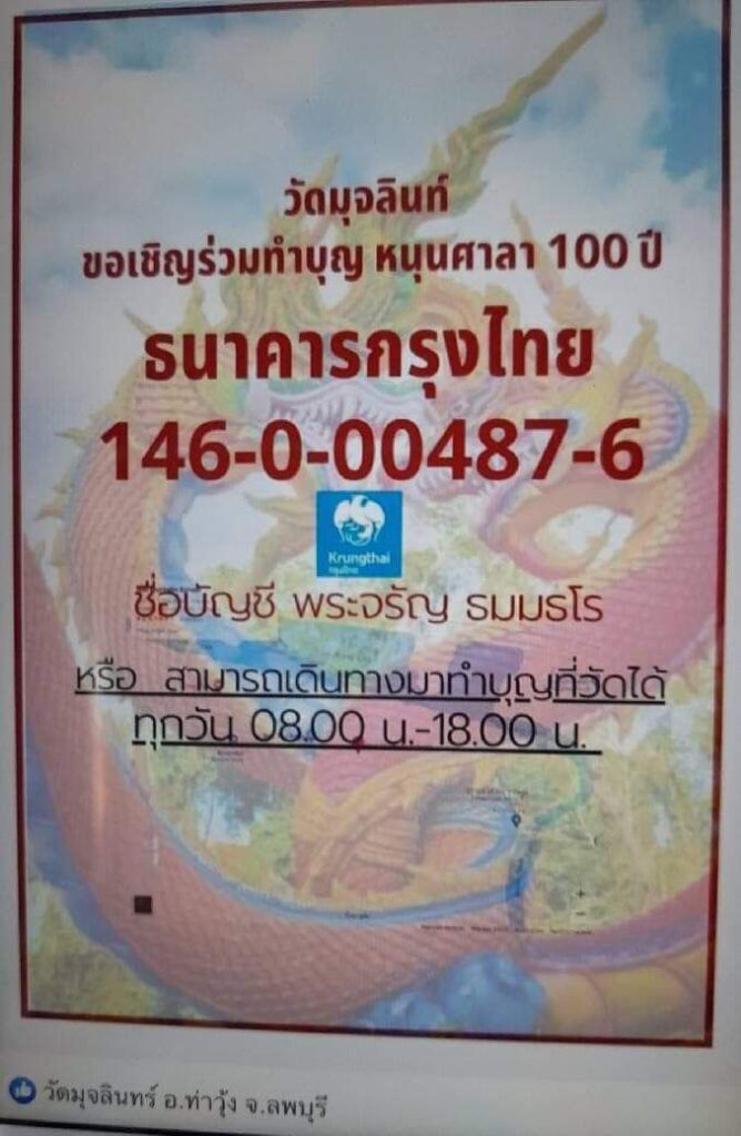 วัดมุจลินทร์ ในนาม.พระจรัญ ธัมมธโร.(ชื่อธนาคารและหมายเลขบัญชี ตามที่ปรากฎในภาพข่าวนี้)