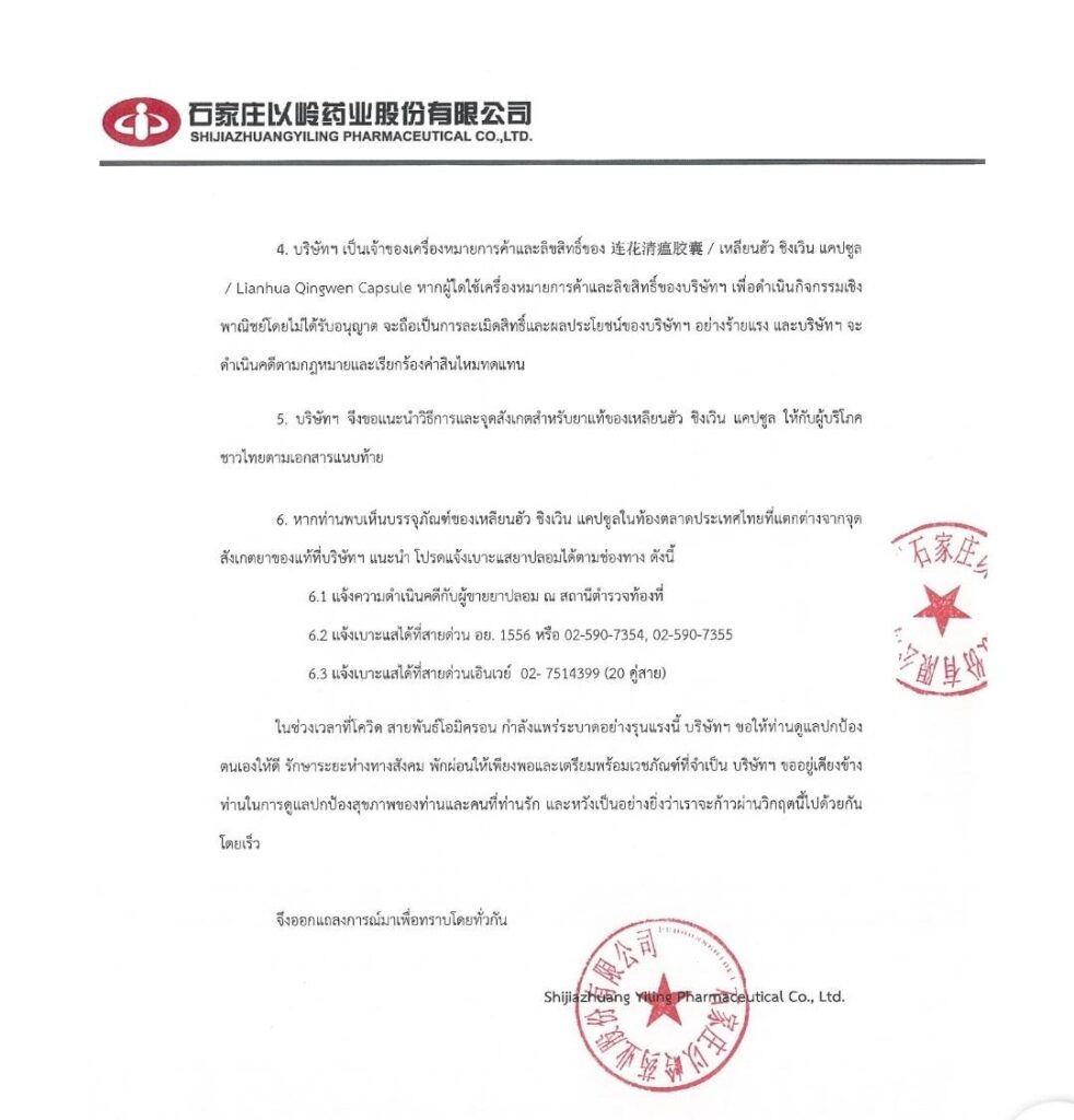 ทั้งนี้ ทาง Shijiazhuang Yiling Pharmaceutical Co., Ltd. ผู้ผลิตเหลียนฮัว ชิงเวิน แคปซูล จึงออกแถลงการณ์อีกครั้งว่า