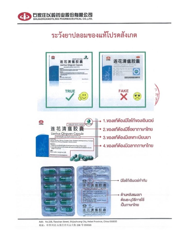 5.Yiling จึงขอแนะนำวิธีการและจุดสังเกตสำหรับยาแท้ของเหลียนฮัว ชิงเวิน แคปซูล ให้กับผู้บริโภคชาวไทยตามเอกสารแนบท้าย
