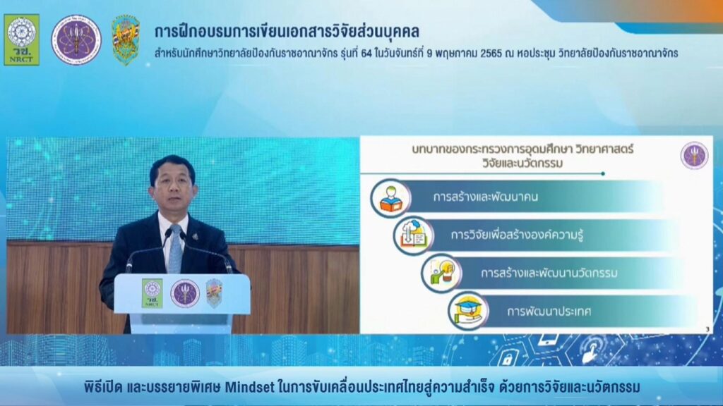 ทรงศิวิไล ปลัดกระทรวงการอุดมศึกษา วิทยาศาสตร์ วิจัยและนวัตกรรม เป็นประธานเปิดการฝึกอบรมฯ พร้อมบรรยายพิเศษ เรื่อง “การขับเคลื่อนประเทศไทยสู่ความสำเร็จด้วยการวิจัยและนวัตกรรม” และ ดร.วิภารัตน์ ดีอ่อง ผู้อำนวยการสำนักงานการวิจัยแห่งชาติ กล่าวรายงาน ณ หอประชุม วิทยาลัยป้องกันราชอาณาจักร (วปอ.)
