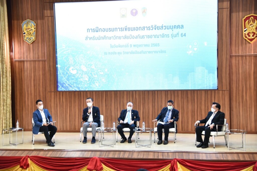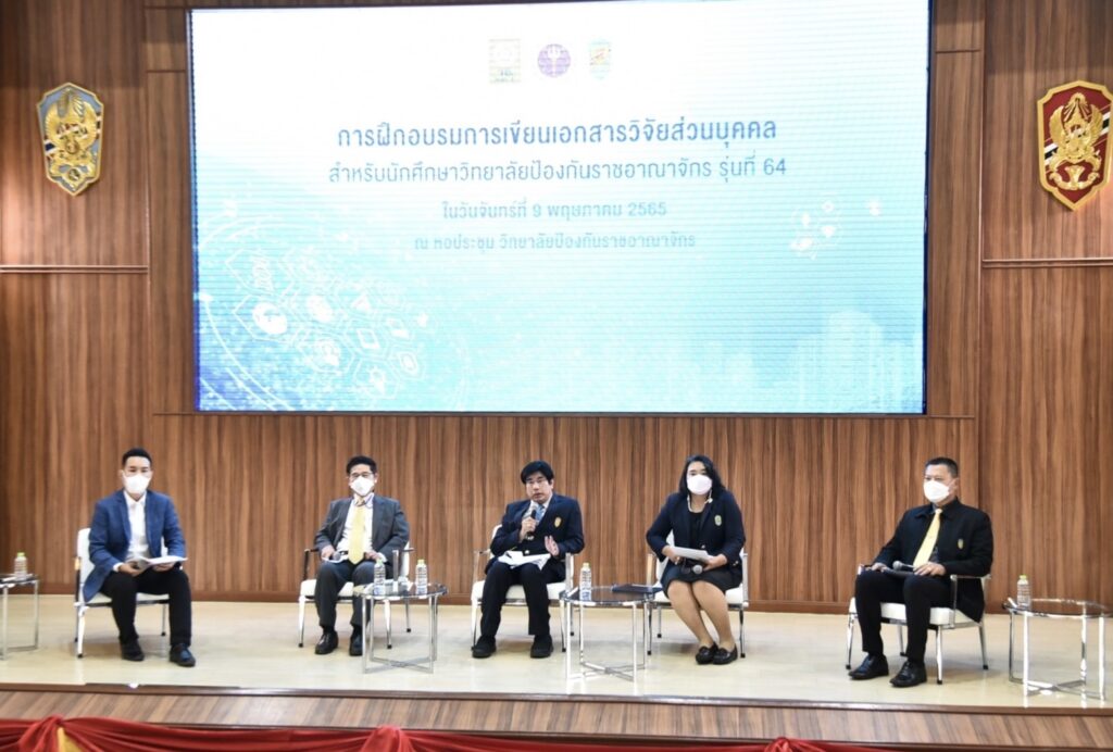 กิจกรรมการเสวนา ในการฝึกอบรมการเขียนเอกสารวิจัยส่วนบุคคลสำหรับนักศึกษาวิทยาลัยป้องกันราชอาณาจักร (วปอ.) รุ่นที่ 64 เรื่อง “ก้าวสู่ความสำเร็จของเอกสารวิจัยบุคคลที่ได้รับรางวัล” ได้รับเกียรติจากวิทยากรผู้ทรงคุณวุฒิ ศิษย์เก่าจาก (วปอ.) ผู้ประสบผลสำเร็จในการได้รับรางวัลเอกสารวิจัยส่วนบุคคลทั้งในระดับดีเด่นและระดับชมเชย ที่มากด้วยความรู้และประสบการณ์มาร่วมบรรยายและถ่ายทอดความรู้ เทคนิควิธีการในการเขียนเอกสารวิจัยส่วนบุคคล รวมถึงสร้างแรงบัลดาลใจในการเขียนเอกสารวิจัยส่วนบุคคลให้กับนักศึกษา (วปอ.) ดังนี้