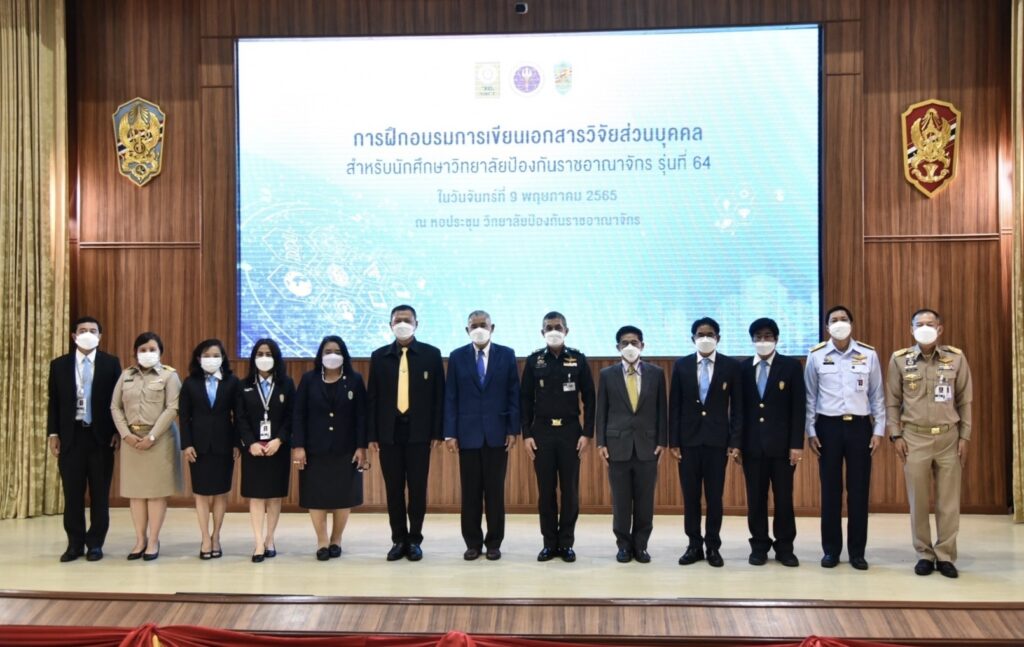 เมื่อวันที่ 9 พฤษภาคม 2565 ที่ผ่านมา สำนักงานการวิจัยแห่งชาติ (วช.) ภายใต้กระทรวงการอุดมศึกษา วิทยาศาสตร์ วิจัยและนวัตกรรม (อว.) ร่วมกับ วิทยาลัยป้องกันราชอาณาจักร (วปอ.) จัดการฝึกอบรมการเขียนเอกสารวิจัยส่วนบุคคลสำหรับนักศึกษาวิทยาลัยป้องกันราชอาณาจักร (วปอ.) รุ่นที่ 64 เพื่อให้นักศึกษามีความรู้ ความเข้าใจ เกี่ยวกับหลักการ แนวทาง และเทคนิคในการเขียนเอกสารวิจัยส่วนบุคคลให้ได้รับรางวัล รวมถึงการถ่ายทอดและแลกเปลี่ยนเรียนรู้องค์ความรู้ร่วมกัน ภายใต้การให้คำปรึกษาแนะนำจากผู้ทรงคุณวุฒิ ศิษย์เก่า และอาจารย์ที่ปรึกษาจาก (วปอ.) โดยมี ศาสตราจารย์ ดร.นายแพทย์ สิริฤกษ์