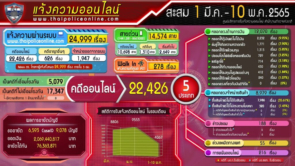 พล.ต.อ.สุวัฒน์ฯ เปิดเผยว่า นับตั้งแต่สำนักงานตำรวจแห่งชาติ เปิดศูนย์รับแจ้งความออนไลน์เมื่อวันที่ 1 มี.ค.-10 พ.ค.65 ที่ผ่านมา มีผู้เสียหายแจ้งความผ่านระบบ 22,426 คดี ความเสียหายเฉลี่ยกว่า 1,500 ล้านบาทต่อเดือน มีการแจ้งความเฉลี่ยวันละ 300 คดี ส่วนใหญ่เป็นการหลอกลวงด้านการเงิน มีคดีที่มีความเชื่อมโยงกันถึง 5,079 คดี ขออายัดเงินไปแล้ว 6,593 บัญชี จากยอดเงิน 2,069,440,817 บาท โดยสามารถอายัดเงินได้ทัน 76,363,871 บาท