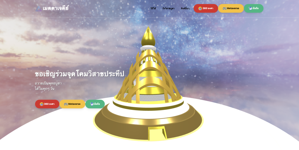 สำหรับผู้ที่ไม่สามารถเดินทางไปร่วมงานวันวิสาขบูชา วัดพระธรรมกายเชิญงานวันวิสาขบูชาผ่าน Metaverse ณ เมตตาเจดีย์ ได้ที่ https://meta.dmc.tv ในวันวิสาขบูชา 15 พ.ค. 2565 ตั้งแต่เวลา 18.30 – 21.00 น. สอบถามรายละเอียดโทร.02-831-1000
