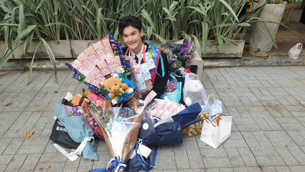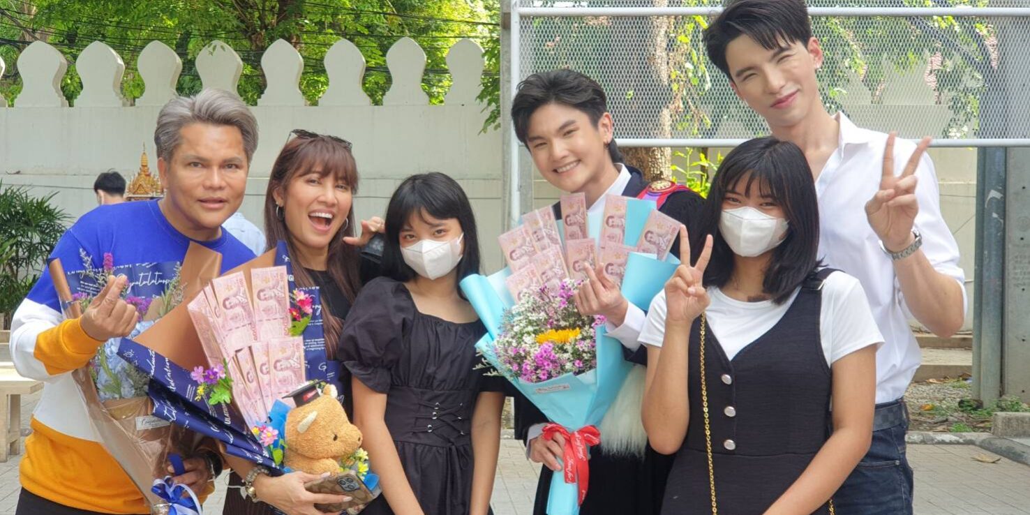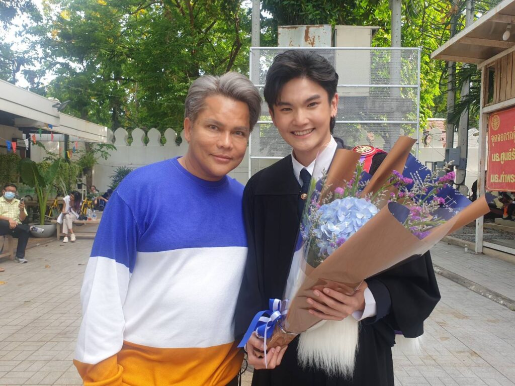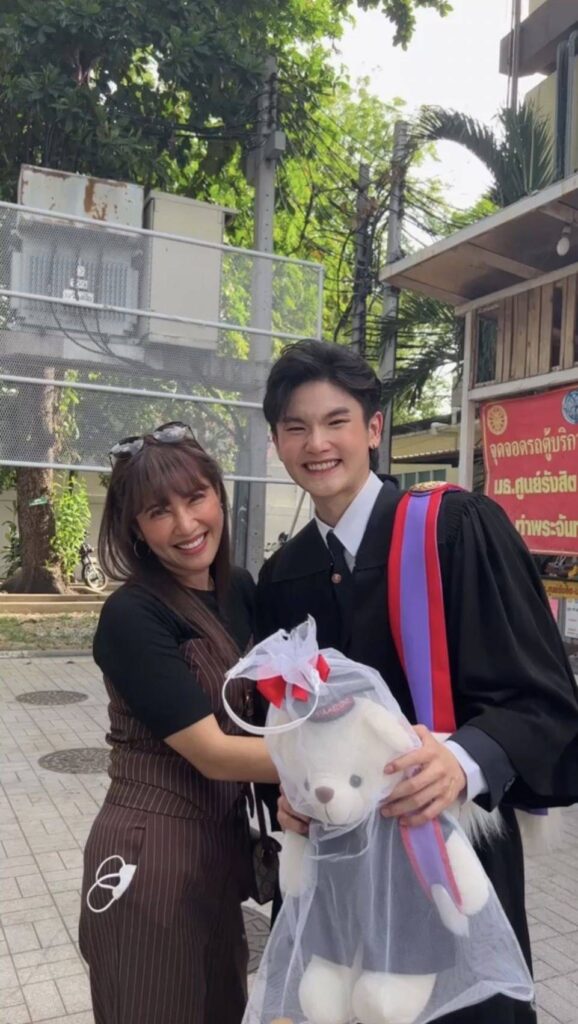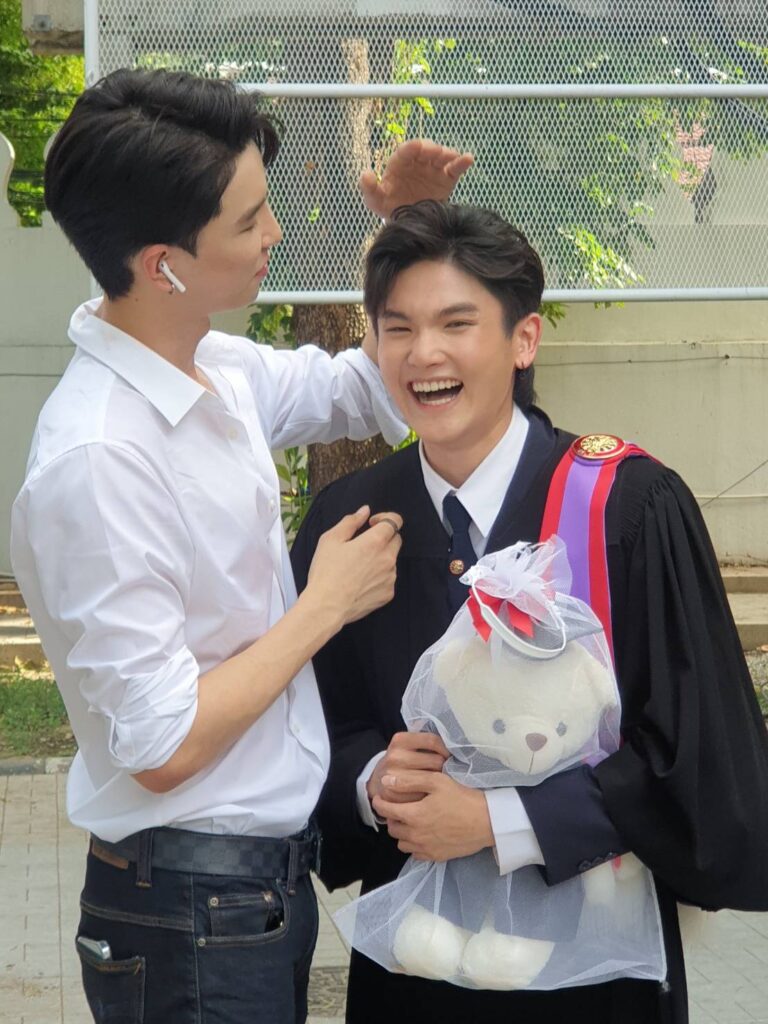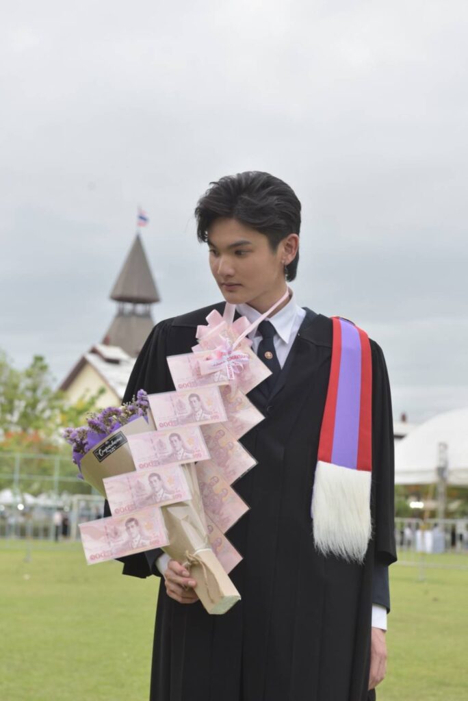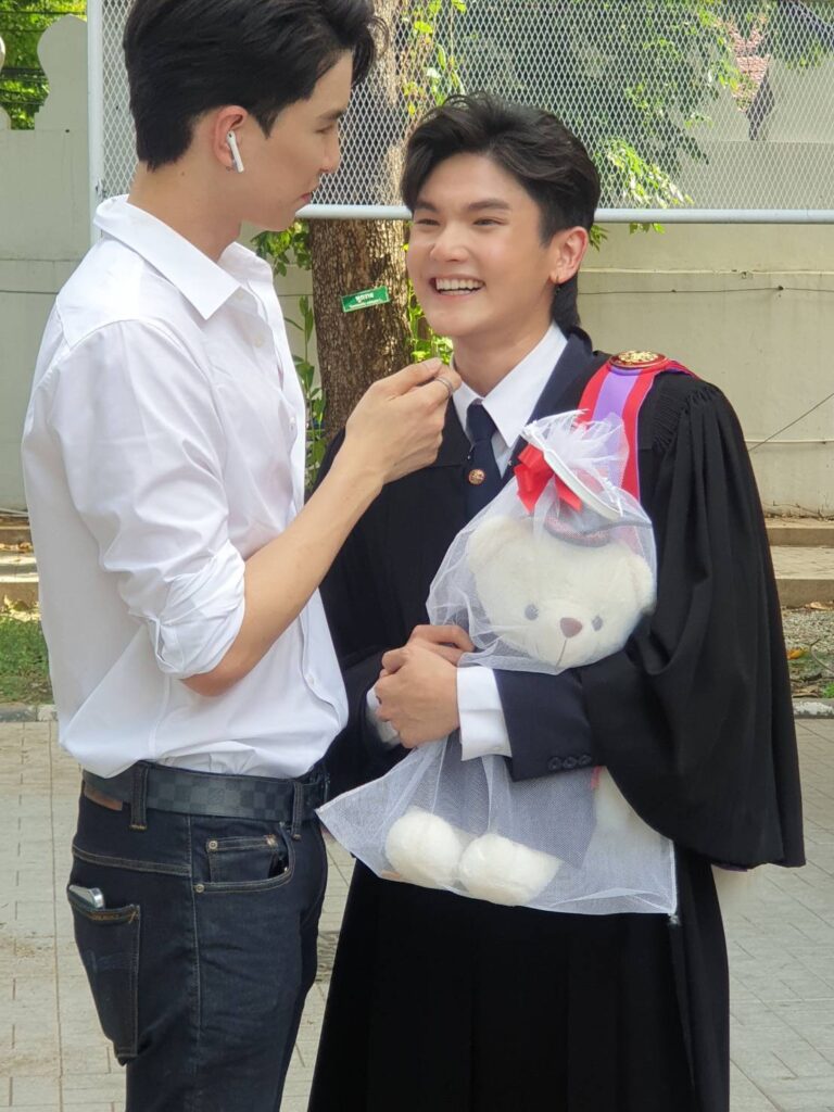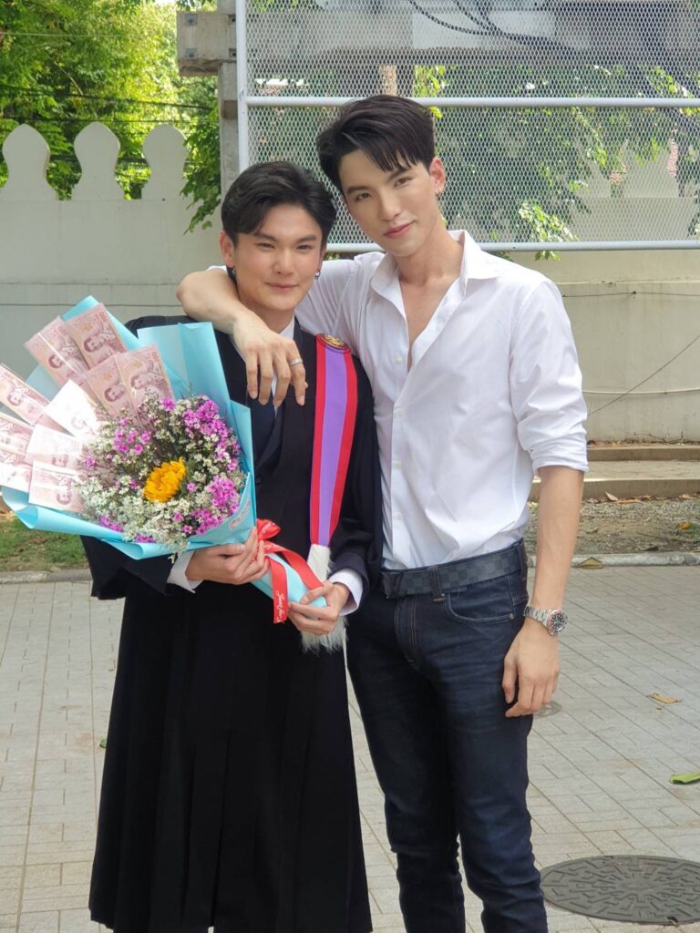 “ดีใจมากๆ ครับ เพราะขึ้นชื่อว่าเป็นคณะที่เรียนจบยากมากๆ (เน้นเสียง) แล้วด้วยความที่ผมทำงานไปด้วยเรียนไป เพิ่งถ่ายซีรีส์ จบไปหลายเรื่องด้วยคือ ต้องแบ่งเวลาดีมากๆ ทำงานเสร็จก็ต้องมาอ่านหนังสือต่อ หรือบางวันที่ขาดเรียนก็ต้องไปรับผิดชอบตามเนื้อหาให้ทัน ส่วนเกรดที่ออกมาก็ค่อนข้างพอใจนะครับ เกรดเฉลี่ยน รวมเกรดเฉลี่ย 3 กว่าๆ ก็รู้สึกภูมิใจมากๆ แล้วก็ต้องขอบพระคุณพี่ชายแฮ็คส์ พี่หญิง พี่จูเนียร์ มากๆ ที่มาร่วมแสดงความยินดีกับในวันนี้ ซึ่งผมก็เข้าศึกษาต่อในระดับ ป.โท เลยครับ ตอนนี้ก็เรียนที่มหาวิทยาลัย CMKL สาขา Entertainment innovation center เพราะอยากเรียนรู้เพิ่มเติมเกี่ยวกับการทำเบื้องหลัง หรือเทคโนโลยี พวกไอเดียต่างๆ เพื่อนำมาพัฒนาวงการบันเทิงไทยและตัวเองด้วยครับ”