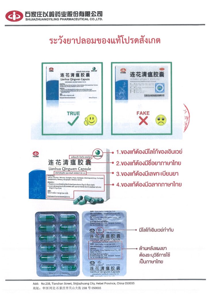 - Yiling จึงขอแนะนำวิธีการและจุดสังเกตสำหรับยาแท้ของเหลียนฮัว ชิงเวิน แคปซูล ให้กับผู้บริโภคชาวไทยตามเอกสารแนบท้าย