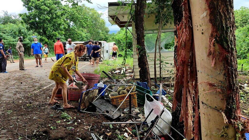 จากการสอบถาม น.ส.สัญญารักน์ ดอกผึ่ง อายุ44ปี อาศัยอยู่เลขที่ 311 หมู่13 ต.ท้ายดง อ.วังโป่ง ผู้เห็นเหตุการณ์ เล่าว่า ตนเองได้ยินเสียงยางระเบิดดังสนั่น แล้วเห็นรถเสียหลัก มาชนต้นไม้ และพุ่งชนป้อมยาง โดยรถขับมาค่อนข้างเร็ว ซึ่งของบนรถส่วนใหญ่เป็นผลไม้ สัปปะรด ทุเรียน มังคุด แตงโม มะพร้าว น่าจะเป็นพ่อค้าแม่ค้าขายผลไม้