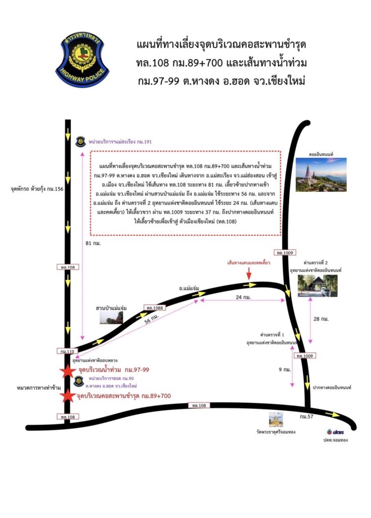 2.ทล.108 กม.97-99 ต.หางดง อ.ฮอด จ.เชียงใหม่ มีน้ำท่วมขังบนผิวทางประมาณ 1 เมตร รถทุกชนิดไม่สามารถผ่านได้