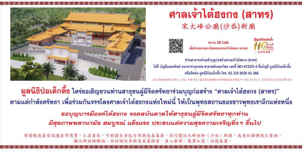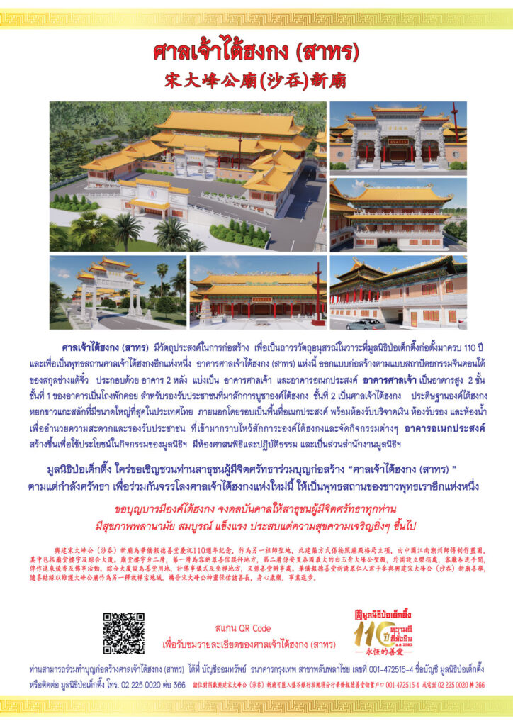 มูลนิธิป่อเต็กตึ๊ง จึงขอเชิญชวนทุกท่าน ร่วมบุญก่อสร้าง ศาลเจ้าไต้ฮงกง (สาทร) ถนนเจริญราษฎร์ แขวงยานนาวา เขตสาทร กรุงเทพมหานคร ตามแต่กำลังศรัทธา เพื่อร่วมกันจรรโลงศาลเจ้าไต้ฮงกงแห่งใหม่นี้ ให้เป็นพุทธสถานอีกแห่งหนึ่ง โดยท่านสามารถร่วมทำบุญได้ที่ บัญชีออมทรัพย์ ธนาคารกรุงเทพ สาขาพลับพลาไชย เลขที่ 001-472515-4