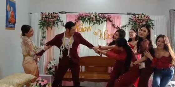 มงคลสมรส ระหว่างที่เจ้าบ่าว หรือ น้องชัย ซึ่งอยู่ในชุดสูทสีแดงทั้งชุดกำลังเดินแห่ขันหมากเข้าไปทำพิธีผูกข้อไม้ข้อมือ(งานแต่ง)