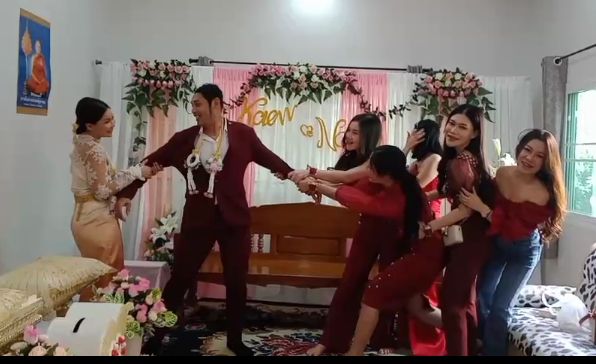 ระหว่างเจ้าสาว น้องแก้ว หรือ น.ส.แก้วตา ใจดี เจ้าสาวคนสวย กับ เจ้าบ่าวฟิตเปรี๊ยะ หนุ่มรูปหล่อ น้องหนุ่ม หรือ นายเฉลิมชัย เพชรรัตน์ หนุ่มรูปหล่อเมืองสุพรรณบุรี เมืองขุนแผน เมื่อขบวนขันหมากเจ้าบ่าวเดินทางมาถึงหน้าบ้านของเจ้าสาว ที่เตรียมจัดงานผูกข้อไม้ข้อมือ