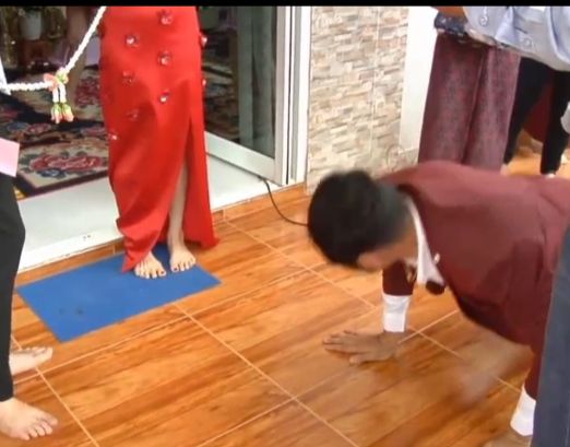ต้องผ่านด่านประตูเงินประตูทองของญาติฝ่ายเจ้าสาวหลายด่าน ด่านแรกเจอกับด่านของญาติเจ้าสาวคนหนึ่งถามว่ารักเจ้าสาวมากมั๊ย เจ้าบ่าวบอกว่ารักมากครับ ก่อนที่ญาติฝ่ายเจ้าสาวจะสั่งให้เจ้าบ่าว แสดงความแข็งแรงที่จะปกป้องเจ้าสาวได้ด้วยกันให้เจ้าบ่าวลงดันพื้นจำนวน 20 ครั้งทันที ซึ่งเจ้าบ่าวก็ไม่อิดออดรีบก้มลงดันพื้นตามคำสั่งของญาติเจ้าสาวแบบสบายๆ ครบ 20 ครั้ง ท่ามกลางเสียงเฮลั่นของญาติเจ้าบ่าวเจ้าสาวทั้งสองฝ่าย”