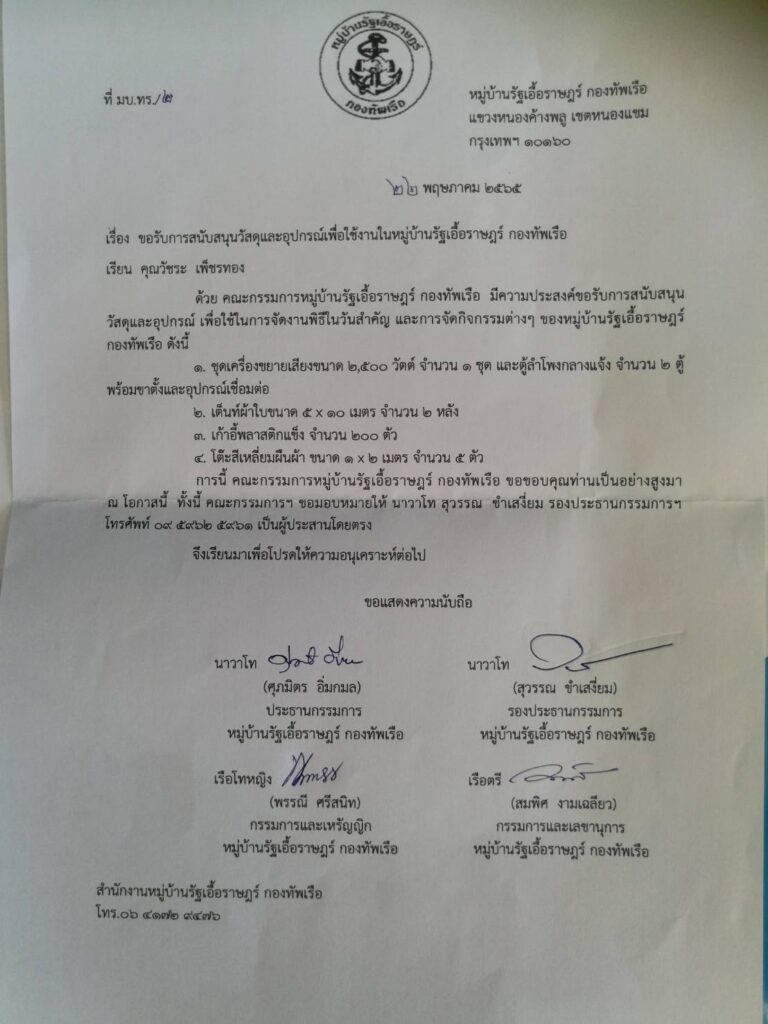 (24 พ.ค.65)เมื่อเวลา 10.00น.นายวัชระ เพชรทอง อดีตส.ส.พรรคประชาธิปัตย์ เปิดเผยว่า ได้รับการขอความอนุเคราะห์จากคณะกรรมการหมู่บ้านรัฐเอื้อราษฎร์ กองทัพเรือ ขอรับการสนับสนุน วัสดุและอุปกรณ์ เพื่อใช้ในการจัดงานพิธีในวันสำคัญ และการจัดกิจกรรมต่างๆ ของหมู่บ้านรัฐเอื้อราษฎร์ กองทัพเรือคือ