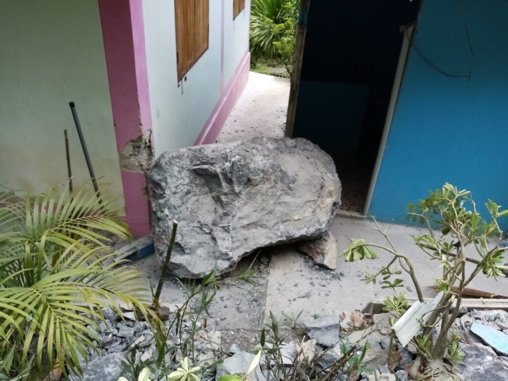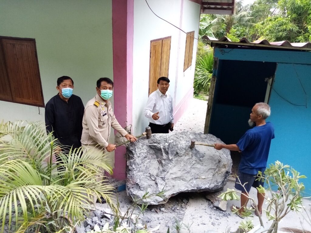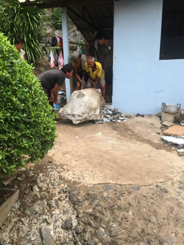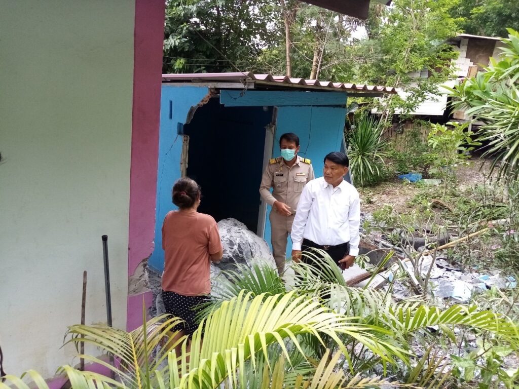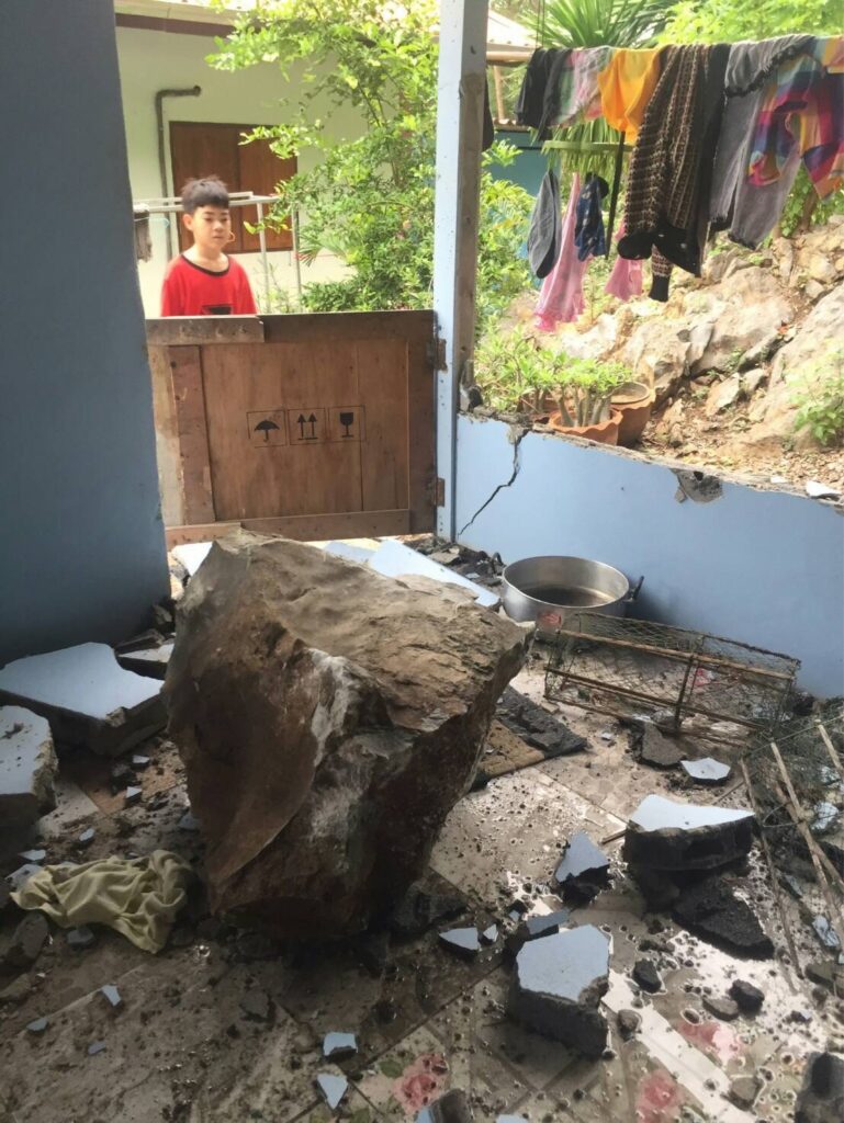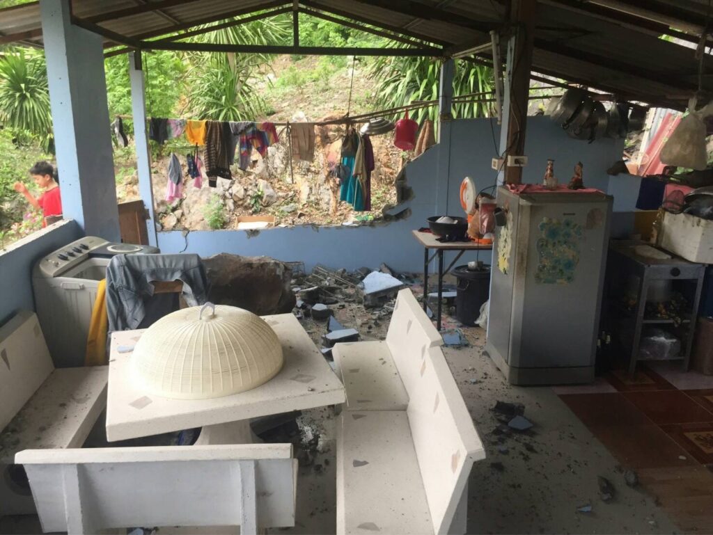 บ้านพักอาศัย ได้รับความเสียหาย เกิดจากก้อนหินขนาดใหญ่ 2-3 ก้อน ลื่นไหลจากที่สูงบนภูเขา วัดถ้ำคูหาสวรรค์