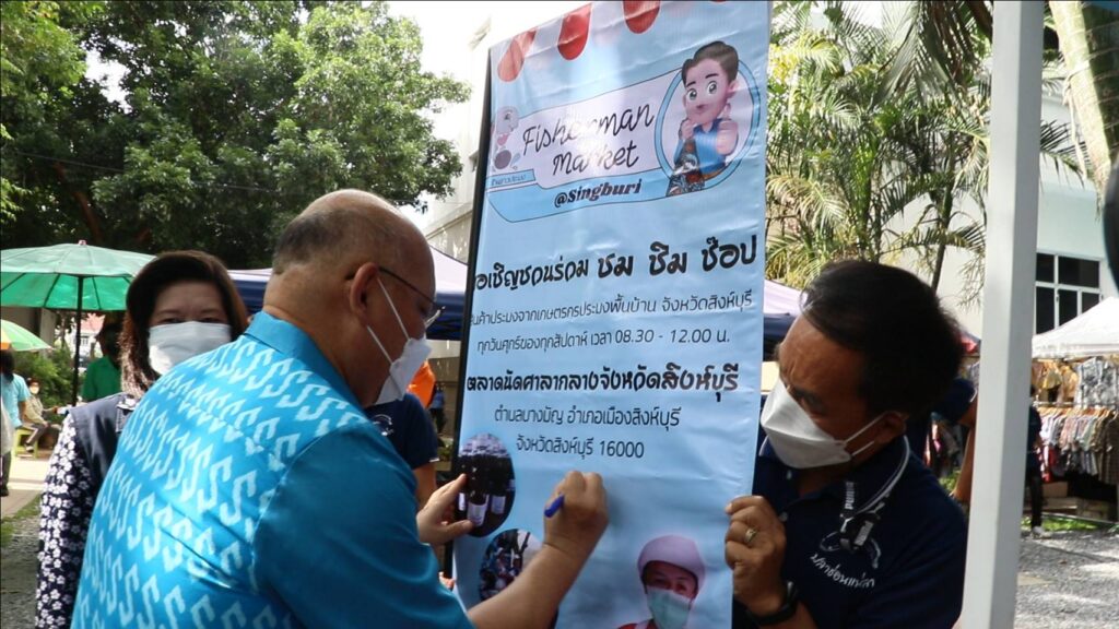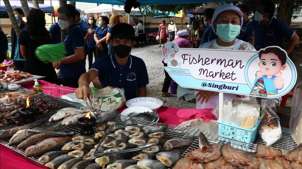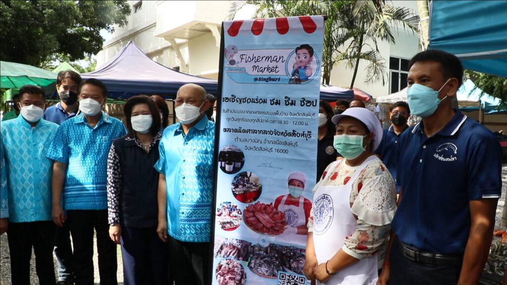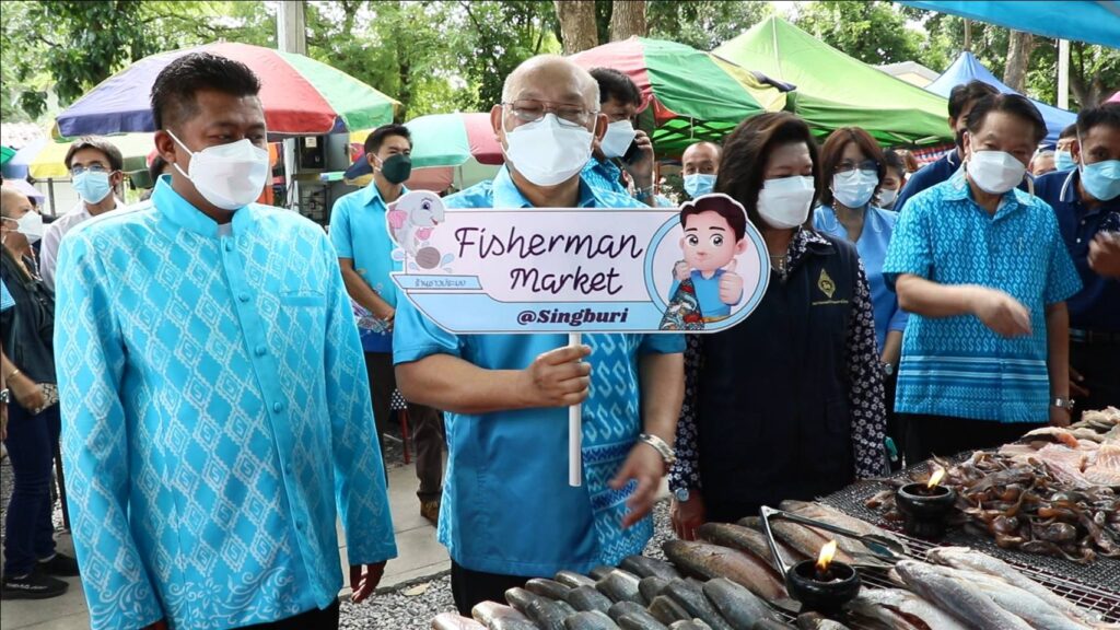 วันที่ 27 พฤษภาคม 2565 นายชัยชาญ สิทธิวิรัชธรรม ผู้ว่าราชการจังหวัดสิงห์บุรี เซ็นชื่อป้ายเปิดร้าน Fisherman Market โครงการกระจายสินค้าประมงพื้นบ้านสู่ผู้บริโภค ณ ตลาดนัดข้างศาลากลางจังหวัดสิงห์บุรี โดยนายอำพร ศักดิ์เศรษฐ ประมงจังหวัดสิงห์บุรี ร่วมกับกลุ่มเกษตรกร กลุ่มวิสาหกิจชุมชนแปรรูปผลิตภัณฑ์สัตว์น้ำในพื้นที่เปลี่ยนให้เป็นร้าน Fisherman Market@ Singburi เพื่อเพิ่มช่องการจำหน่ายสินค้าแปรรูปผลิตภัณฑ์สัตว์น้ำและเพิ่มรายได้ให้เกษตรกร ตามนโยบายเร่งด่วนของกรมประมงในการเพิ่มช่องทางการจำหน่ายสินค้าผลิตภัณฑ์จาการทำประมงพื้นบ้านของกลุ่มชาวประมงพื้นบ้านจังหวัดสิงห์บุรี ในช่วงสถานการณ์การแพร่ระบาดของเชื้อไวรัสโควิด-19 โดยมี นายสัมฤทธิ์ กองเงิน รองผู้ว่าราชการจังหวัดสิงห์บุรี นายสมชาย ลีหล้าน้อย รองผู้ว่าราชการจังหวัดสิงห์บุรี นายกเหล่ากาชาดจังหวัดสิงห์บุรี หัวหน้าส่วนราชการ ข้าราชการ และพนักงาน ในศาลากลางจังหวัดสิงห์บุรี ช่วยกันอุดหนุนซื้อสินค้าประมงพื้นบ้านทุกวันศุกร์ของทุกสัปดาห์ เวลา 8.30-12.00น. ณ ตลาดนัดข้างศาลากลางจังหวัดสิงห์บุรี