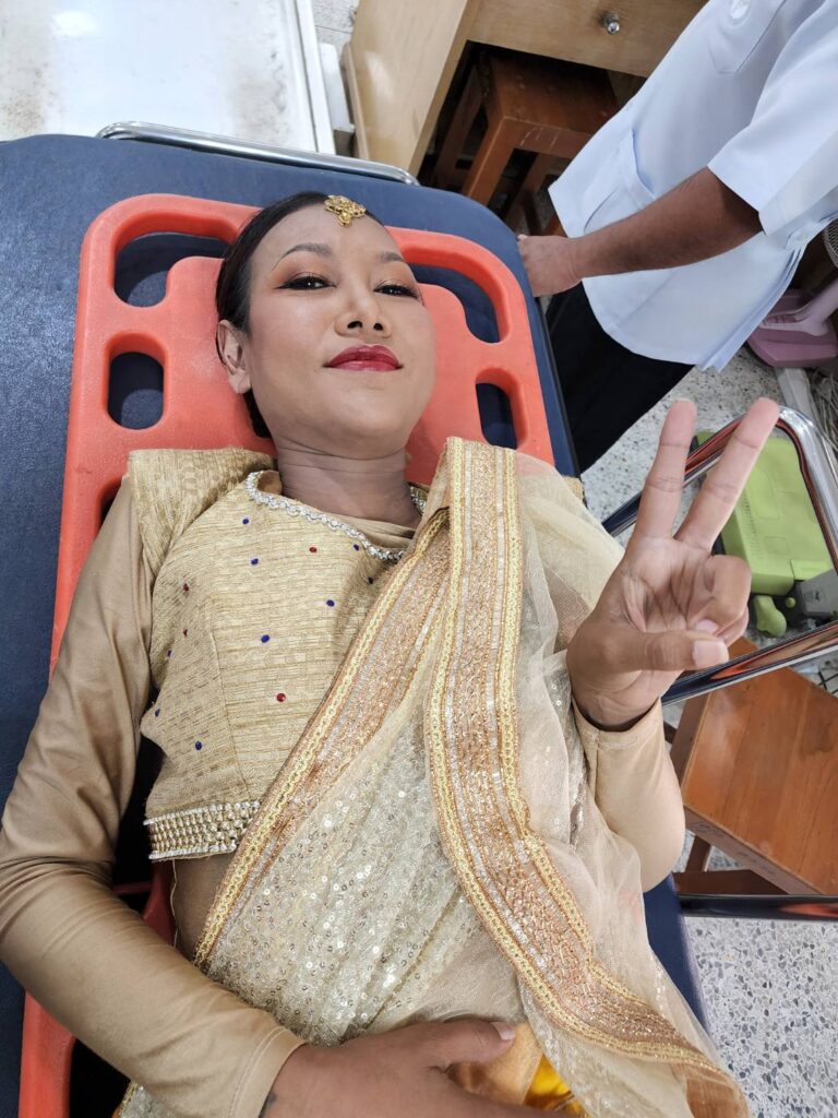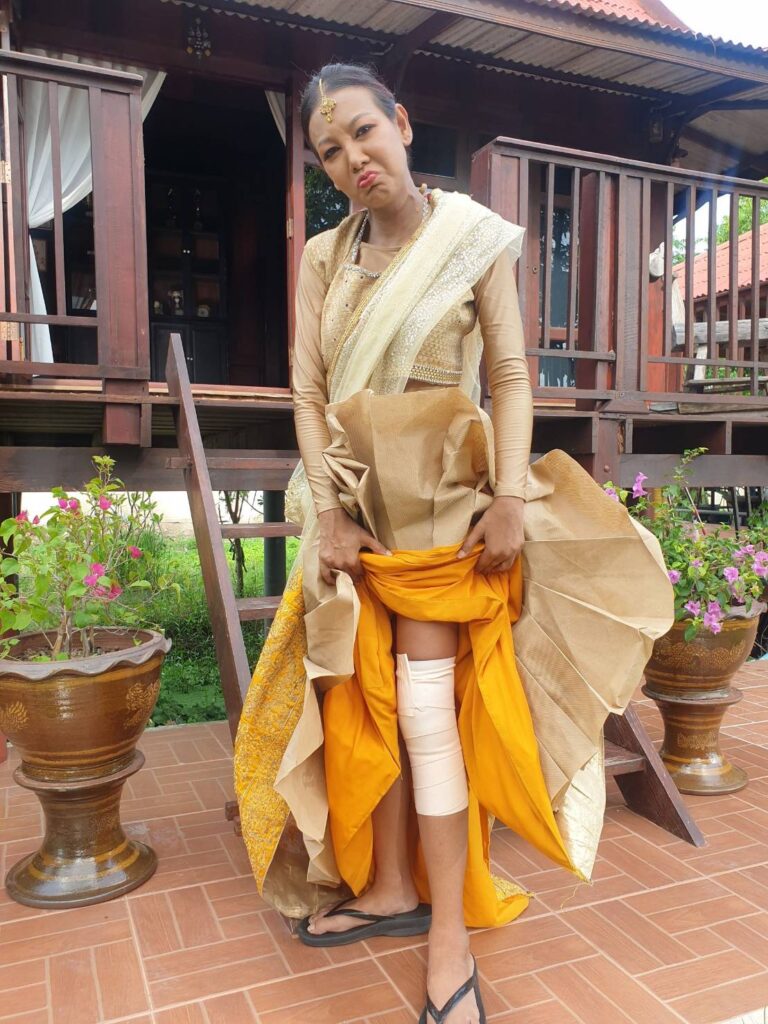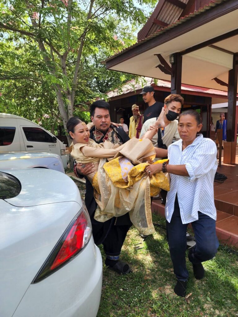 พอผู้กำกับฯ (น้าหมู วลงกรณ์) สั่งคัท หญิงกำลังจะลุกขึ้น เข่าก็ทรุดลงเลย แล้วเสียงดังก๊อก คือเหมือนเข่าหลุด เข่าห้อยเลย งอเข่าไม่ได้ ลุกขึ้นยืนไม่ได้ ทีมงานก็ไม่กล้ามาแตะ เกรงว่าจะเกิดอันตราย แล้วหญิงก็ลุกไม่ได้เลย เจ็บมากด้วย ทีมงานก็เลยอุ้มนำส่งโรงพยาบาลที่ใกล้ที่สุด คือตอนนั้นคิดว่า เข่าหลุดแน่ๆ ถ้าหลุดแล้วทำไง จะทำงานได้มั้ย ใจหายเลย เกือบร้องไห้ กลัวทำงานหาเงินไม่ได้ เพราะหญิงก็ยังต้องฟอกเลือดอยู่ตลอด ทุกวันนี้มีรายได้จากการขายน้ำส้ม และถ่ายละครบ้าง ถ้าเกิดบาดเจ็บ จนทำงานไม่ได้ต้องแย่แน่ๆ เลยค่ะ แต่โชคดีที่แค่เข่าฉีก หมอบอกมีเลือดออกนิดหน่อย ทำให้เจ็บ จ่ายยาแก้ปวดมาทานที่บ้าน พอยืนได้ ก็ต้องเข้าฉากถ่ายละครต่อ เพราะตัวปทุมมาต้องประกบกับ นางวิสาขา ตลอด ก็สู้ตาย เพื่องานที่เรารักค่ะ”