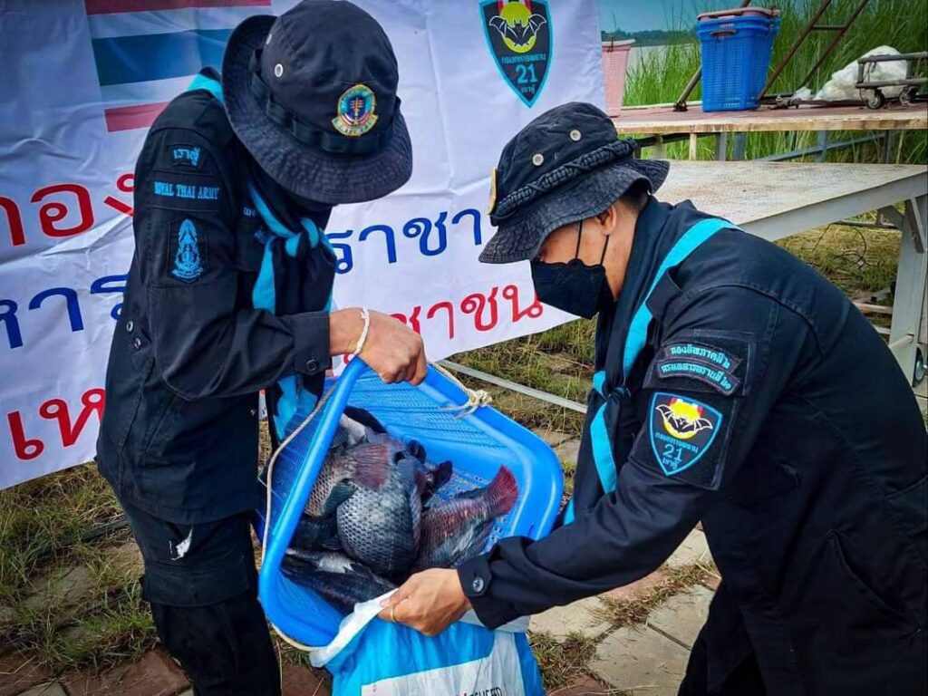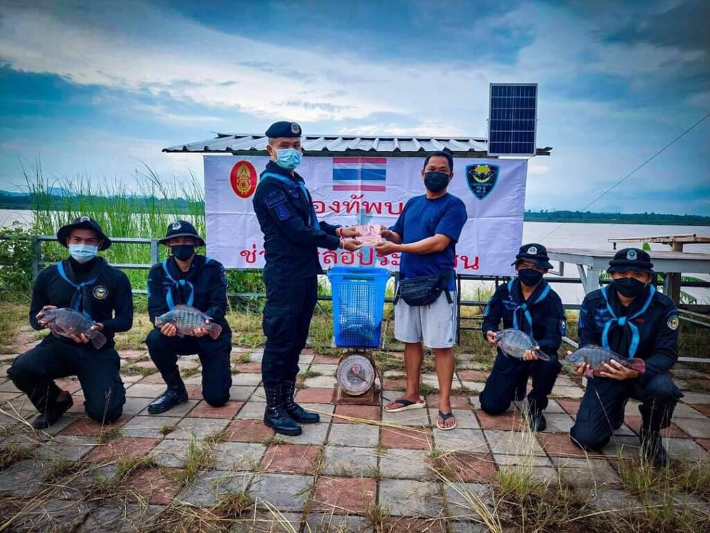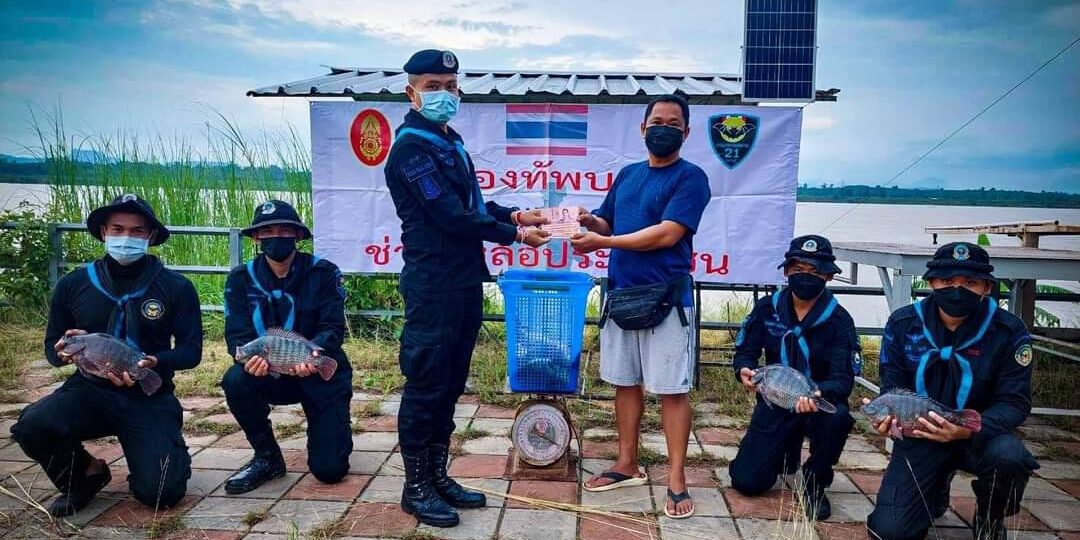 กองกำลังสุรศักดิ์มนตรี โดย พันเอก อุทัย นิลเนตร ผู้บังคับการกรมทหารพรานที่ 21/ผู้บังคับหน่วยเฉพาะกิจกรมทหารพรานที่ 21 มีความเป็นห่วงชาวเกษตรกรนครพนม จึงได้สั่งการให้กองร้อยทหารพรานที่ 2108 หน่วยเฉพาะกิจกรมทหารพรานที่ 21จัดกำลังพลลงพื้นที่เข้าช่วยเหลือประชาชนรับซื้อผลผลิตทางการเกษตรจากเกษตรกร ภายใต้โครงการของกองทัพบกเข้าช่วยเหลือพี่น้องเกษตรทั่วประเทศที่ประสบปัญหาผลผลิตล้นตลาด ราคาตกต่ำ กองทัพบกช่วยแบ่งเบาปัญหา ตามโครงการ “ทหารอิ่มท้อง พี่น้องเกษตรกรอิ่มใจ” จากพี่น้องเกษตรกรจึงเดินเท้าบุกกระชังปลาริมแม่น้ำโขง ช่วยรับซื้อปลาของ นายวนิต แพงเนตร อายุ 41 ปี บ้านเลขที่ 62 ม.9 บ.ท่าลาด ต.บ้านแพง อ.บ้านแพง จ.นครพนมช่วยเหลือพี่น้องประชาชนจากพิษโควิด-19 เป็นปลานิล Size ใหญ่ ในราคากิโลกรัมละ 70 บาท จำนวน 30 กิโลกรัม รวมเป็นเงิน 2,100 บาท เพื่อนำไปประกอบเลี้ยงให้กับกำลังพลของหน่วยได้รับประทาน ทางด้านนายวนิต แพงเนตร มีความพึงพอใจเป็นอย่างยิ่ง ที่หน่วยให้การสนับสนุนช่วยซื้อปลานิลของตน ทำให้มีรายได้ไว้ใช้จ่ายในครัวเรือน พร้อมขอบคุณที่หน่วยเฉพาะกิจกรมทหารพรานที่ 21ที่ได้ ให้การช่วยเหลือแก่ประชาชนในพื้นที่ ด้วยดีตลอดมา