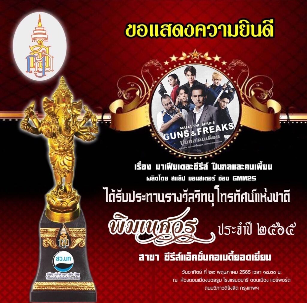 นอกจากนี้ น้องรีวอร์ด-จิรัฎฐ์ ยังได้รับรางวัลสาขา นักแสดงหน้าใหม่ยอดเยี่ยม จากเรื่องนี้ด้วย ก็ดีใจแทนน้องเค้าด้วยครับ ที่สำคัญ มาเฟียเดอะซีรีส์ ก็ใกล้จะจบแล้ว เหลืออีก 2-3 ep ผมก็อยากให้ทุกคนได้ดู Mafia The Series: Guns & Freaks (มาเฟียเดอะซีรีส์ ปืนกลและคนเพี้ยน) กันครับ เป็นผลงานที่พวกเราทุกคนตั้งใจทำกันจริงๆ พวกเราใส่ไปกันจนสุดแม็กแล้วครับ จนไม่เหลือแล้ว เป็นกำลังใจให้พวกเรา สแล็ป มอนสเตอร์ ด้วยนะครับ”
