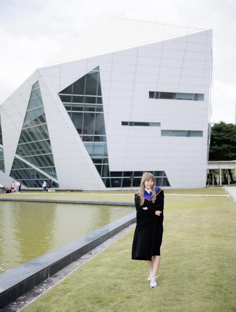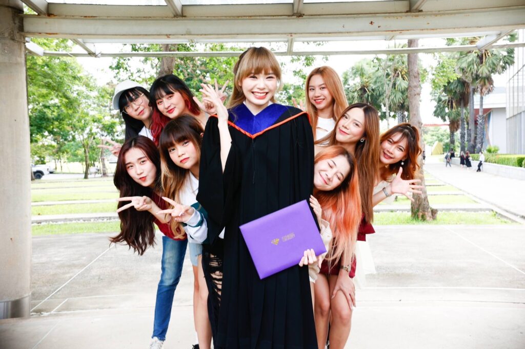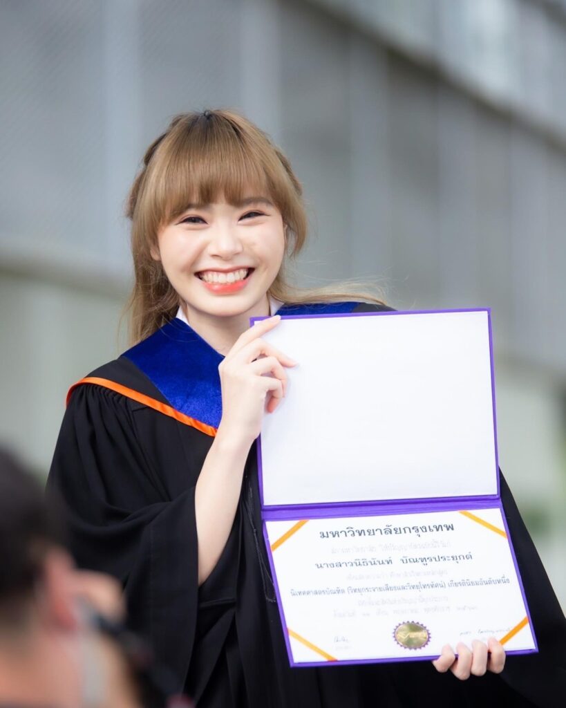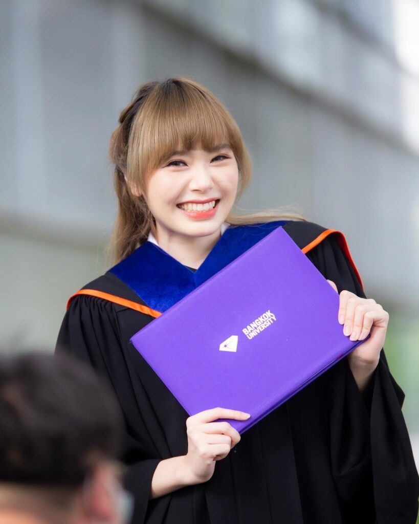ดีใจค่ะ จบสักที (หัวเราะ) เพราะรุ้งก็เรียนไปด้วย ทำงานไปด้วย ช่วงปีสุดท้ายก็หนักหน่อย เพราะมีงานเข้ามาเยอะมาก แล้วก็ต้องสอบจบด้วย แต่ก็สู้ และให้กำลังใจตัวเองเยอะๆ รวมทั้งคุณพ่อคุณแม่ คนในครอบครัว ก็ให้กำลังใจรุ้งตลอดเวลา รวมทั้งพี่ๆ น้องๆ ในวง Wisdom พวกเราเป็นกำลังใจให้กันและกันมาตลอด รุ้งขอขอบพระคุณพี่วิเนตร พี่เนย ผู้จัดการวงมากๆ นะคะ ที่ให้โอกาสรุ้ง และให้โอกาสน้องๆ ทุกคนในวง เรียนจบแล้ว สัญญาว่าจะทำงานให้ดีและเต็มที่ที่สุดค่ะ”