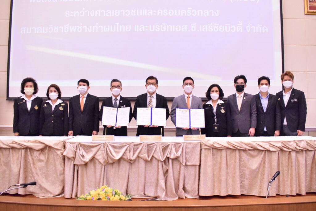 เมื่อวันที่ 1 มิถุนายน 2565 เวลา 09.00 น. ณ ห้องประชุมใหญ่ ชั้น 5 ศาลเยาวชนและครอบครัวกลาง : นายประกอบ ลีนะเปสนันท์ อธิบดีผู้พิพากษาภาค 7 ช่วยทำงานชั่วคราวในตำแหน่งอธิบดีผู้พิพากษาศาลเยาวชนและครอบครัวกลาง,นายสมศักดิ์ ชลาชล นายกสมาคมวิชาชีพ ช่างทำผมไทย,นายวิบูลย์ สมบูรณ์ศักดิกุล ประธานกรรมการบริหารบริษัท เอส.ซี.เสรีชัยบิวตี้ จำกัด ได้ลงนามบันทึกข้อตกลงความร่วมมือสนับสนุนการฝึกทักษะวิชาชีพช่างทำผม ระหว่าง ศาลเยาวชนและครอบครัวกลาง,สมาคมวิชาชีพช่างทำผมไทย และบริษัท เอส.ซี. เสรีชัยบิวตี้ จำกัด โดยมี นายปริญญา เชาวลิตถวิล รองอธิบดี ผู้พิพากษาศาลเยาวชนและครอบครัว ผู้พิพากษาสมทบ ข้าราชการและเจ้าหน้าที่ ร่วมเป็นสักขีพยาน ณ ห้องประชุมใหญ่ ชั้น 5 ศาลเยาวชนและครอบครัวกลาง