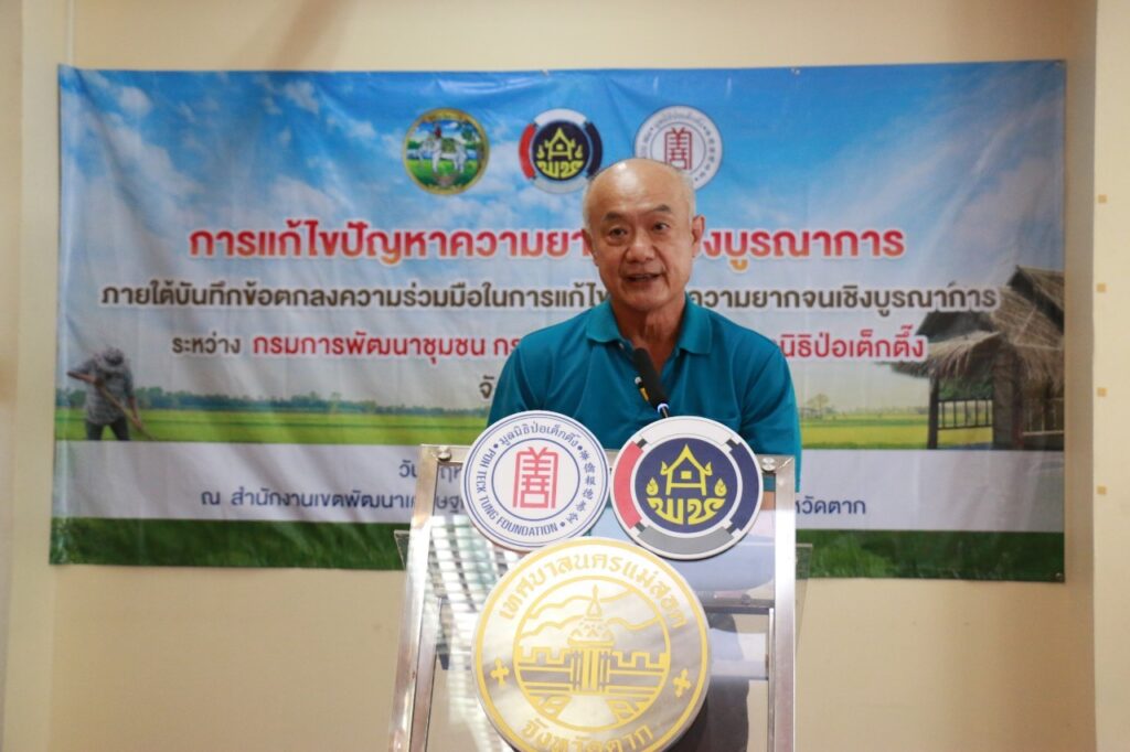 วานนี้ (วันที่ 2 มิถุนายน 2565 เวลา 14.00 น. ) มูลนิธิป่อเต็กตึ๊ง โดย นายสุรพงษ์ เตชะหรูวิจิตร กรรมการและรองเลขาธิการ เป็นประธานในพิธี พร้อมด้วย นายสุรพงศ์ เสรฐภักดี กรรมการและรองเหรัญญิก ร่วมในพิธีมอบอุปกรณ์ประกอบอาชีพให้กับครัวเรือนยากจนในพื้นที่จังหวัดตาก จำนวน 6 ครัวเรือน คิดเป็นมูลค่าทั้งสิ้น 68,950 บาท เพื่อส่งเสริมและสนับสนุนอาชีพแก่ครัวเรือนยากจนสามารถประกอบอาชีพเลี้ยงตนเองและครอบครัว ดำเนินชีวิตตามหลักปรัชญาเศรษฐกิจพอเพียง ภายใต้ ”บันทึกข้อตกลงความร่วมมือการแก้ไขปัญหาความยากจนเชิงบูรณาการ” ร่วมกับกรมการพัฒนาชุมชน กระทรวงมหาดไทย โดยมี นายสุรพล วงศ์สุขพิศาล รองผู้ว่าราชการจังหวัดตาก และนายนิวัติ น้อยผาง รองอธิบดีกรมการพัฒนาชุมชน กระทรวงมหาดไทย เป็นประธานร่วมในพิธี พร้อมด้วยนางศิริพร กระจ่างหล้า ผู้จัดการฝ่ายสังคมสงเคราะห์ มูลนิธิป่อเต็กตึ๊ง นางสาวศุภรัตน์ สมบัติเจริญไทย รักษาการหัวหน้าแผนกส่งเสริมการศึกษาและอาชีพ ฝ่ายสังคมสงเคราะห์ฯ และคณะแม่สอดมูลนิธิสามัคคีการกุศล จังหวัดตาก ร่วมในพิธี ณ บริเวณสำนักงานเขตพัฒนาเศรษฐกิจพิเศษตาก อำเภอแม่สอด จังหวัดตาก