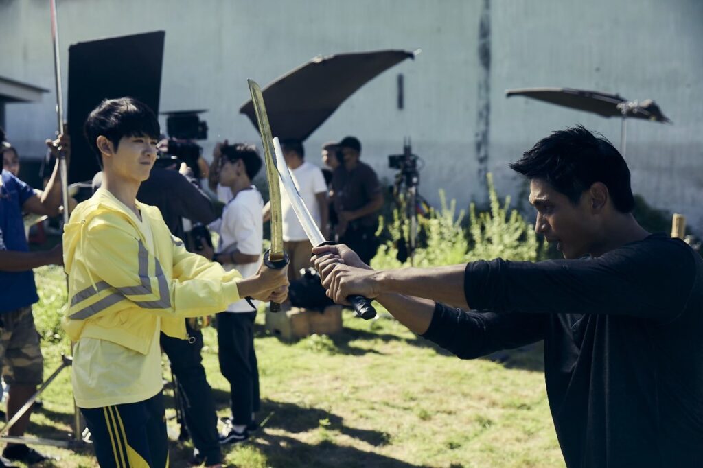 สองผู้กำกับฯ คนเก่ง โน้ต พรรณพันธ์ และ คุณโจ ปิยะวัฒน์ รวมทั้งทีมงานเซ็ทตึกร้างแห่งหนึ่งเป็นสถานที่สอนการใช้อาวุธของ 3 หนุ่ม ที่ดูเหมือนว่าจะสดใส และสดชื่นมากๆ เพราะมีต้นไม้เขียวๆ อยู่ล้อมรอบ เพื่อให้การฝึกครั้งนี้ไม่ดูโหดจนเกินไปนัก (หรือเปล่า) โดยทีมงานขอถ่ายฉากด้านในเสียก่อน มีนักแสดงมาพร้อมหน้า ทั้ง 3 หนุ่ม จุง เจมส์ รีวอร์ด ที่ถือได้ว่าเป็น ลูกศิษย์ ส่วนครูผู้สอนก็มาครบทีม ทั้ง จีน่า ธันน์ และเพลิง รวมทั้งกรรมการตัดสิน เอ้ย… ผู้ประเมินอย่างหนุ่มฟลุ๊ค ก็เข้าร่วมฉากด้วย