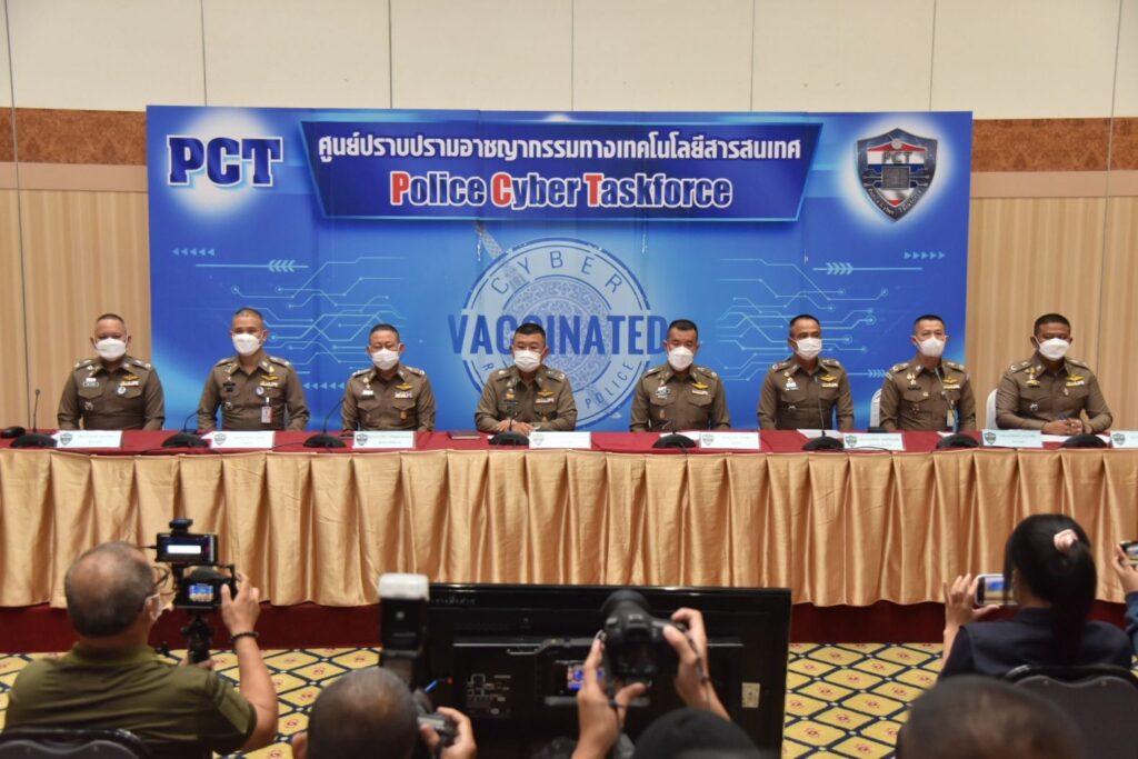 วันที่ 7 มิ.ย.65 เวลา 10.30 น. : พล.ต.อ.ดำรงศักดิ์ กิตติประภัสร์ รอง ผบ.ตร. ผู้อำนวยการศูนย์ปราบปรามอาชญากรรมทางเทคโนโลยีสารสนเทศ (ศปอส.ตร.) หรือ PCT,พล.ต.อ.ปรีชา เจริญสหายานนท์ ที่ปรึกษาพิเศษ ตร.,พล.ต.ท.ปิยะ ต๊ะวิชัย ผบช.ภ.5,พล.ต.ท.จิรภพ ภูริเดช ผบช.ก.,พล.ต.ต.ธีรเดช ธรรมสุธีร์ ผบก.สส.ภ.2 หน.ชป.5 PCT,พล.ต.ต.ศารุติ แขวงโสภา ผบก.ปอท.,พล.ต.ต.นิเวศน์ อาภาวศิน ผบก.ตอท.,พล.ต.ต.ธวัชชัย พงษ์วิวัฒน์ชัย ผบก.จ.เชียงใหม่ ร่วมแถลงผลการจับกุมขบวนการแฮกไลน์ ผู้เสียหายจำนวนมาก มูลค่าความเสียหายรวมกว่า 50 ล้านบาท
