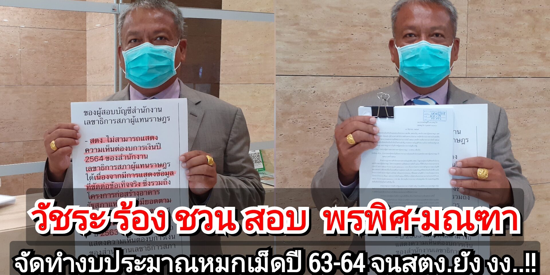(7 มิ.ย.65)ที่อาคารรัฐสภา เมื่อเวลา 12.30น.นายวัชระ เพชรทอง อดีตส.ส.พรรคประชาธิปัตย์ ยื่นหนังสือผ่านนางธนพร จันทร์เลิศดี ผู้บังคับบัญชากลุ่มงานบริหารทั่วไปและสารบรรณถึงนายชวน หลีกภัยประธานรัฐสภาและประธานสภาผู้แทนราษฎร ขอให้สอบสวนข้อเท็จจริงและสอบจริยธรรมนางพรพิศ เพชรเจริญ เลขาธิการสภาผู้แทนราษฎร และนางมณฑา น้อยแย้ม ผู้อำนวยการสำนักการคลังและงบประมาณ กรณีสำนักงานการตรวจเงินแผ่นดิน (สตง.) ไม่สามารถแสดงความเห็นต่อรายงานการเงินปี 2564 และมีความเห็นรายงานการเงินปี 2563 ไม่ถูกต้อง ขัดต่อข้อเท็จจริงอันเป็นสาระสำคัญ ตามพระราชบัญญัติวินัยการเงินการคลังของรัฐ พ.ศ. 2561 และมาตรฐานการบัญชีภาครัฐและนโยบายการบัญชีภาครัฐ