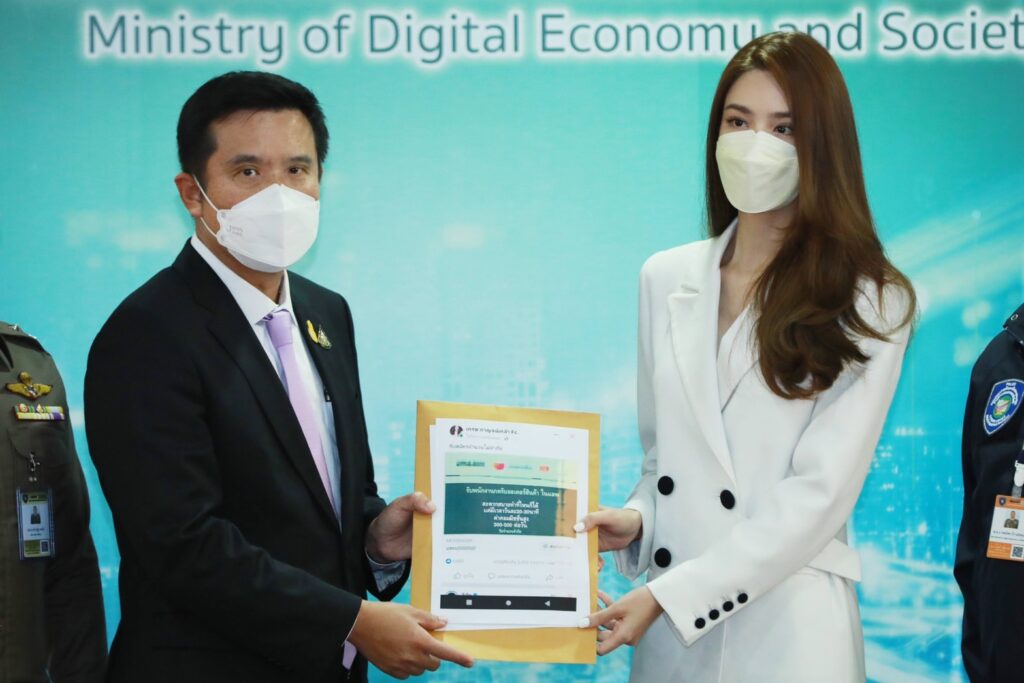 วันที่ 8 มิ.ย.65 : นายชัยวุฒิ ธนาคมานุสรณ์ รัฐมนตรีว่าการกระทรวงดิจิทัลเพื่อเศรษฐกิจและสังคม (ดีอีเอส) ร่วมกับ พ.ต.อ.ทำนุรัฐ คงมั่น รองผู้บังคับการ กองบังคับการตำรวจสืบสวนสอบสวนอาชญากรรมทางเทคโนโลยี 1 (รองผบก.สอท.1) แถลงข่าว “เกรซ กาญจน์เกล้า ด้วยเศียรเกล้า นักแสดง เดินทางมายื่นเรื่องต่อรมว.ดิจิทัลฯ พร้อมแจ้งความออนไลน์ กรณีถูกปลอมเฟซบุ๊ก” พร้อมเรียกร้องปิดเพจปลอมทันที