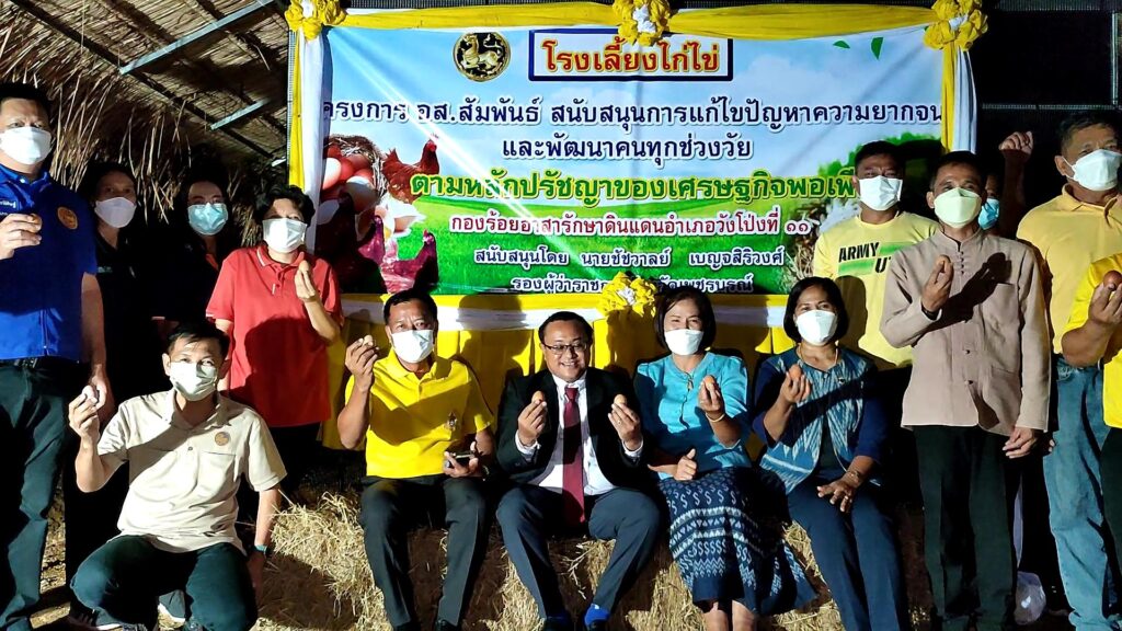 ในการนี้ นายชัชวาลย์ เบญจสิริวงศ์ รองผู้ว่าราชการจังหวัดเพชรบูรณ์ ได้ผลักดันให้ทางอำเภอวังโป่ง เป็นอำเภอนำร่อง โดยทาง กองร้อยอาสารักษาดินแดนอำเภอวังโป่งที่ 11ได้ดำเนินการ จัดทำโครงการ อส.สัมพันธ์ สนับสนุนการแก้ไขปัญหาความยากจนและพัฒนาคนทุกช่วงวัย โดยจัดสร้างโรงเลี้ยงไก่ไข่ จำนวน 1 หลัง พร้อมไก่ไข่ จำนวน 60 ตัว คอยหมั่นเลี้ยงดูให้อาหาร เพื่อนำไข่ไก่ที่ได้แต่ละวัน มาจัดสรรให้พอเพียง สำหรับนำไปแจกจ่ายให้ผู้ยากไร้ และผู้ป่วยติดเตียง ใน 5 ตำบล อำเภอวังโป่ง หากโครงการดังกล่าว เกิดผลสัมฤทฺธิ์และเป็นรูปธรรม ก็เตรียมส่งเสริมไปยังอำเภออื่น ต่อไป