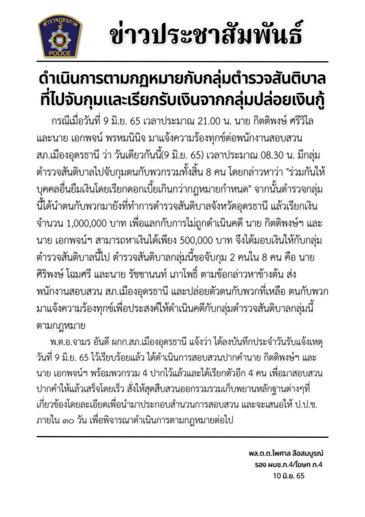 รอง ผบช.ภ.4/โฆษก ภ.4 กล่าวถึง กรณีเมื่อวันที่ 9 มิ.ย.65 เวลาประมาณ 21.00 น. นายกิตติพงษ์ ศรีวิไล และ นายเอกพจน์ พรหมนินิจ มาแจ้งความร้องทุกข์ต่อพนักงานสอบสวน สภ.เมืองอุดรธานี ว่า วันเดียวกันนี้ (9 มิ.ย.65) เวลาประมาณ 08.30 น. มีกลุ่มตำรวจสันติบาลไปจับกุมตนกับพวกรวมทั้งสิ้น 8 คน โดยกล่าวหาว่า “ร่วมกันให้บุคคลอื่นยืมเงินโดยเรียกดอกเบี้ยเกินกว่ากฎหมายกำหนด” จากนั้นตำรวจกลุ่มนี้ได้นำตนกับพวกมายังที่ทำการตำรวจสันติบาลจังหวัดอุดรธานี แล้วเรียกเงินจำนวน 1,000,000 บาท เพื่อแลกกับการไม่ถูกดำเนินคดี นาย กิตติพงษ์ฯ และนาย เอกพจน์ฯ สามารถหาเงินได้เพียง 500,000 บาท จึงได้มอบเงินให้กับกลุ่มตำรวจสันติบาลนี้ไป ตำรวจสันติบาลกลุ่มนี้ขอจับกุม 2 คนใน 8 คน คือ นายศิริพงษ์ โฉมศรี และนายรัชชานนท์ เภาโพธิ์ ตามข้อกล่าวหาข้างต้น ส่งพนักงานสอบสวน สภ.เมืองอุดรธานี และปล่อยตัวตนกับพวกที่เหลือ ตนกับพวกมาแจ้งความร้องทุกข์เพื่อประสงค์ให้ดำเนินคดีกับกลุ่มตำรวจสันติบาลกลุ่มนี้ตามกฎหมาย