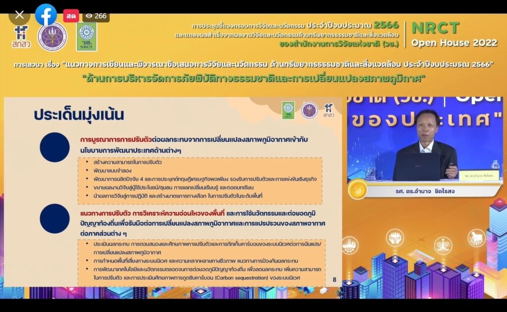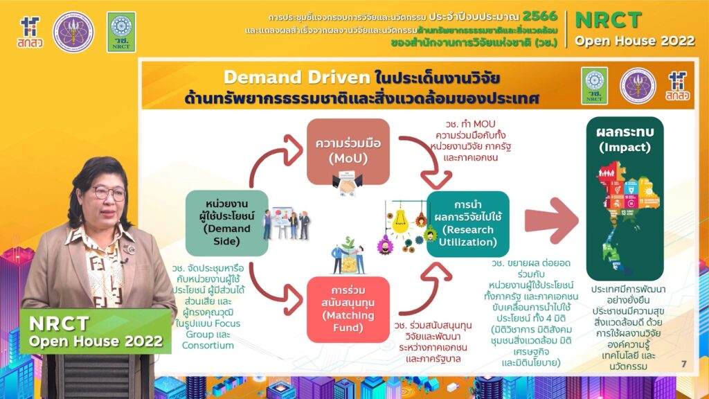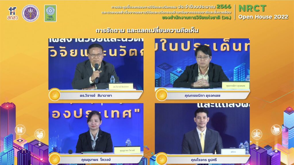 ดร.วิภารัตน์ ดีอ่อง ผู้อำนวยการสำนักงานการวิจัยแห่งชาติ (วช.) กล่าวว่า (วช.) ภายใต้กระทรวงการอุดมศึกษา วิทยาศาสตร์ วิจัยและนวัตกรรม (อว.) ได้จัดการชี้แจงกรอบการวิจัยและนวัตกรรม ปี 2566 และการแถลงผลสำเร็จจากการวิจัยและนวัตกรรม NRCT Open House ระหว่างวันที่ 12–19 มิถุนายน 2565 ซึ่งในวันนี้เป็นวันที่สอง จะเป็นด้านทรัพยากรธรรมชาติและสิ่งแวดล้อม (วช.) ได้มีการมองร่วมกันในหลายส่วนทั้งในเรื่องสถานการณ์โลก เรื่องสถานการณ์ในระดับภูมิภาค และสถานการณ์ที่เกี่ยวข้องในพื้นที่ของประเทศไทย