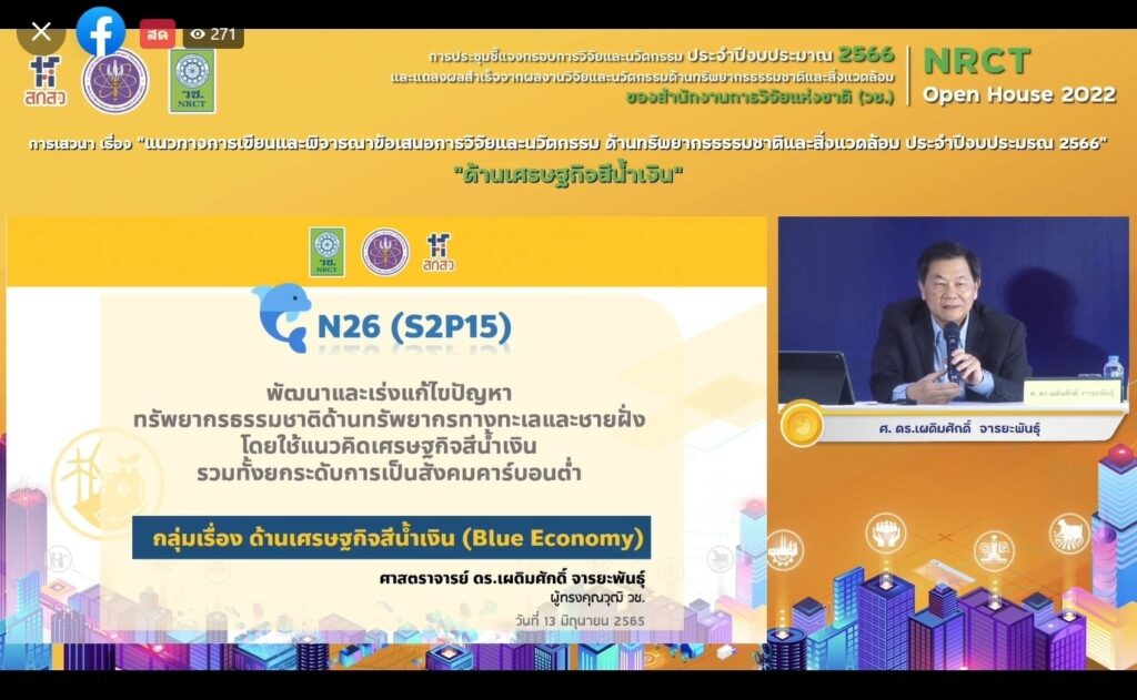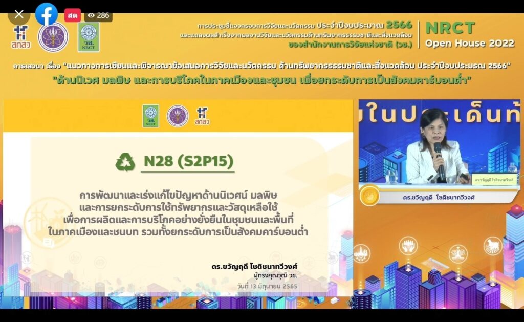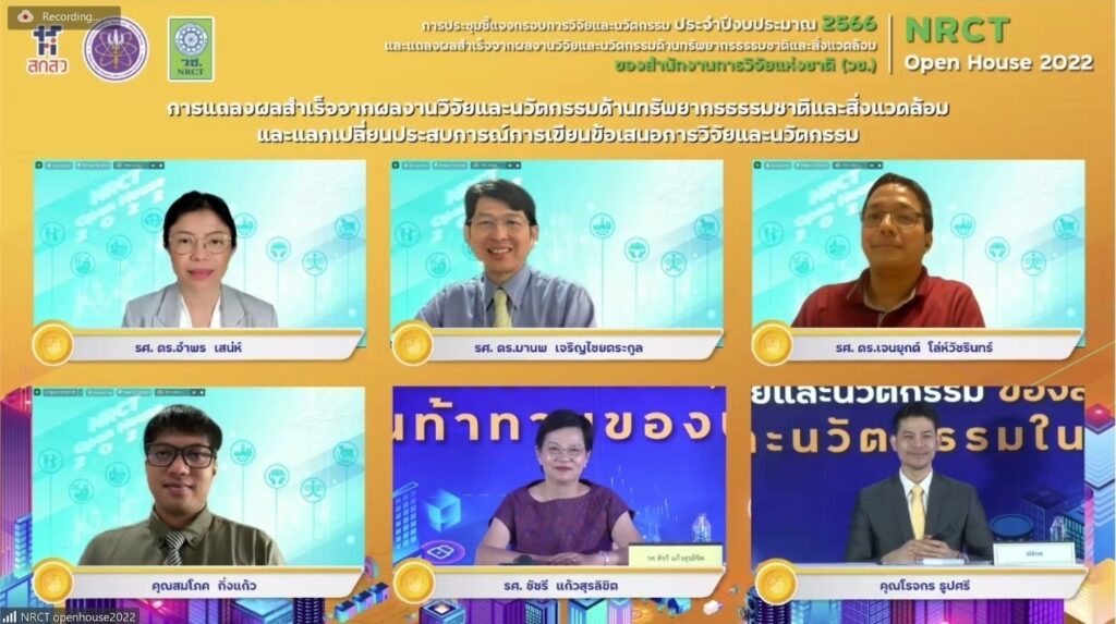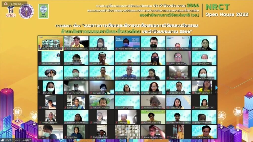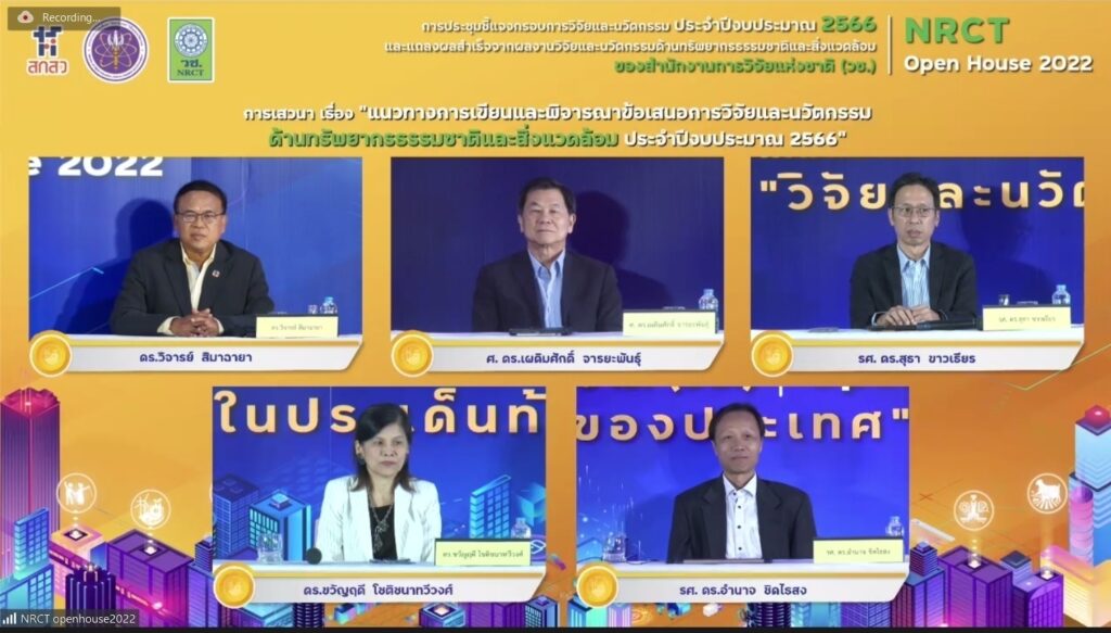 วันที่ 13 มิถุนายน 2565 สำนักงานการวิจัยแห่งชาติ (วช.) กระทรวงการอุดมศึกษา วิทยาศาสตร์ วิจัยและนวัตกรรม (อว.) จัดการประชุมชี้แจงกรอบการวิจัยและนวัตกรรมด้านทรัพยากรธรรมชาติและสิ่งแวดล้อม ประจำปีงบประมาณ 2566 และการแถลงผลสำเร็จจากผลงานวิจัยและนวัตกรรมด้านทรัพยากรธรรมชาติและสิ่งแวดล้อม NRCT Open House 2022 “วิจัยและนวัตกรรมในประเด็นท้าทายของประเทศ” เพื่อชี้แจงกรอบการวิจัยและนวัตกรรม ประจำปีงบประมาณ 2566 ของ (วช.) และแนวทางการเขียนและพิจารณาข้อเสนอการวิจัยและนวัตกรรม รวมทั้งแถลงผลสำเร็จจากการวิจัยและนวัตกรรม เพื่อเป็นเวทีแลกเปลี่ยนประสบการณ์การเขียนข้อเสนอการวิจัยและนวัตกรรมและการยื่นขอทุน (วช.) ด้านทรัพยากรธรรมชาติ และสิ่งแวดล้อม โดย ดร.วิภารัตน์ ดีอ่อง ผู้อำนวยการสำนักงานการวิจัยแห่งชาติ (วช.) เป็นประธานเปิดการประชุมฯ
