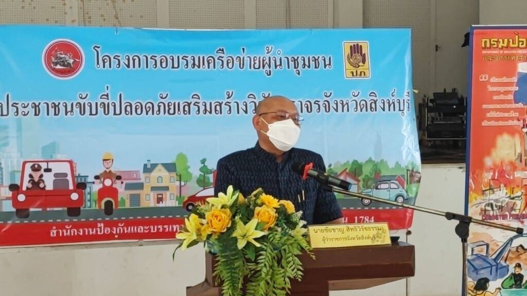 ด้วยจังหวัดสิงห์บุรี มีสถิติการเกิดอุบัติเหตุจราจรทางถนนในแต่ละเดือน เฉลี่ยถึง ๖๐ ครั้ง ต่อเดือน และมีผู้เสียชีวิต เกินกว่าร้อยละ ๒๐ ของจำนวนประชากรทั้งจังหวัด ซึ่งเป็นอัตราการสูญเสียทั้งชีวิตและทรัพย์สินค่อนข้างสูง อันเกิดจากการไม่สวมหมวกนิรภัยในขณะขับขี่รถจักรยานยนต์ สำนักงานป้องกันและบรรเทาสาธารณภัยจังหวัดสิงห์บุรี จึงได้จัดทำโครงการอบรมเครือข่ายผู้นำชุมชน ประชาชนขับขี่ปลอดภัย เสริมสร้างวินัยจราจรจังหวัดสิงห์บุรีขึ้น โดยมี และ นางสาววรรณพร พรหมทอง ผู้ช่วยหัวหน้า สำนักงาน ปภ.จังหวัดสิงห์บุรี เป็นผู้กล่าวรายงาน ซึ่งมีวัตถุประสงค์ ดังนี้