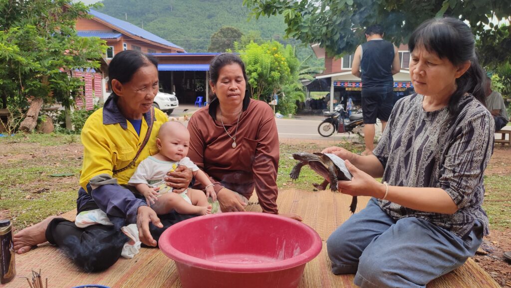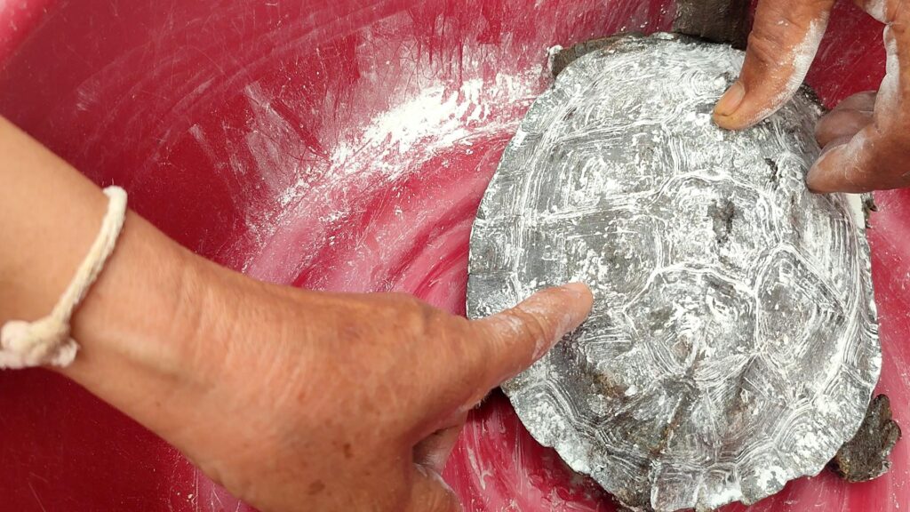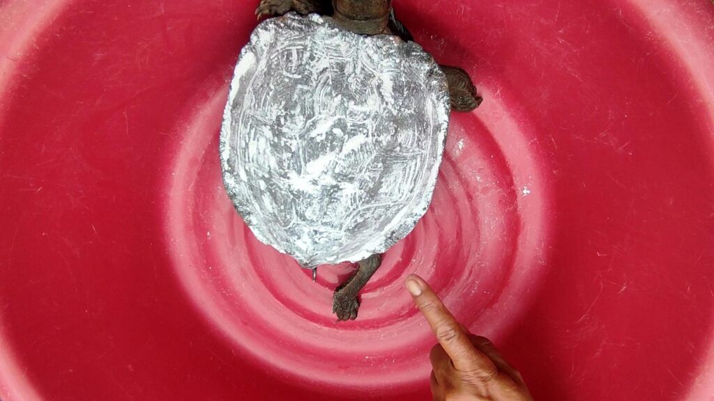 จากการสอบถาม นายแผน ปันแสง อายุ72 ปี เล่าว่า เต่าตัวนี้ เดินเข้ามาหาถึงในบ้าน จึงคิดว่า คงหิวน้ำ หิวอาหาร เลยเลี้ยงไว้ โดยไม่คิดจะทำร้าย และเชื่อว่า เต่าจะมาให้โชคลาภ จึงพากันทำพิธีเสี่ยงโชค หวังนำเลขเด็ดไปซื้อหวย พอเสร็จพิธี ก็จะล้างแป้ง ทำความสะอาด ก่อนนำไปปล่อยคืนสู่ธรรมชาติต่อไป