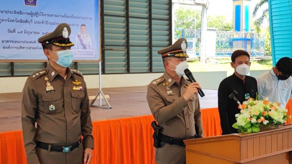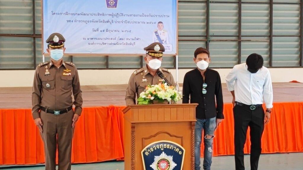 วันนี้ 15 มิ.ย. 65 เวลา 11.00 น. พล.ต.ต.วีรวิชญ์ บัวประเสริฐยิ่ง ผบก.ภ.จว.สิงห์บุรี เป็นประธาน พ.ต.อ.เอกราช อุ่นเจริญ รอง ผบก.ฯ ร่วมพิธีเปิด โครงการฝึกอบรมพัฒนาประสิทธิภาพผู้ปฏิบัติงานสายงานป้องกันปราบปรามของ ภ.จว.สิงห์บุรี ประจำปีงบประมาณ 2565 ตามนโยบายการบริหารราชการ สำนักงานตำรวจแห่งชาติ โดยเน้นการพัฒนา และเสริมสร้างความรู้ ความชำนาญให้แก่ข้าราชการตำรวจในแต่ละระดับ เพื่อให้มีความรู้ ความสามารถ ตามตำแหน่งหน้าที่ได้อย่างมีประสิทธิภาพ ณ อาคารเอนกประสงค์(โดม) สนามกีฬา อบจ.สิงห์บุรี และมีผู้ให้การสนับสนุนดังนี้ 1. พ.ต.อ.กฤษณัฐ วงศ์กล้าหาญ รอง ผบก.ภ.จว.สิงห์บุรี สนับสนุนอาหารว่าง เครื่องดื่มและผลไม้ 2. คุณอนรรฆพรชัย อักษรดี กรรมการผู้จัดการห้างหุ้นส่วนสามัญนิติบุคคล 3. คุณวันเพ็ญ อภินันทร์ นายก อบต.บ้านแป้ง คุณธรรมรัฐ อภินันทร์ กรรมการบริษัทวันพัฒน์ ขนส่ง จำกัด สนับสนุนอาหารกลางวัน