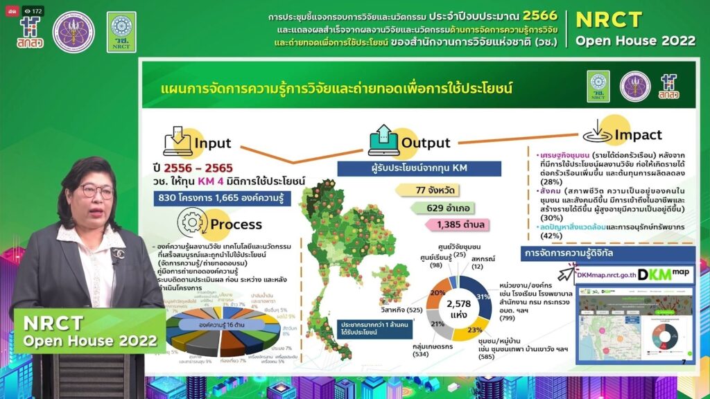 ดร.วิภารัตน์ ดีอ่อง ผู้อำนวยการสำนักงานการวิจัยแห่งชาติ (วช.) กล่าวว่า (วช.) ภายใต้กระทรวง (อว.) ได้จัดการประชุมชี้แจงกรอบการวิจัยและนวัตกรรม NRCT Open House 2022 จัดขึ้นเป็นวันที่สี่แล้ว วันนี้เป็นการประชุมด้านการจัดการความรู้การวิจัยและถ่ายทอดเพื่อการใช้ประโยชน์ (KM) ประจำปีงบประมาณ 2566 และการแถลงผลสำเร็จจากผลงานวิจัยและนวัตกรรมด้านการจัดการความรู้การวิจัยและถ่ายทอดเพื่อการใช้ประโยชน์ ซึ่ง (วช.) มุ่งมั่นส่งเสริมเส้นทางการขับเคลื่อนการใช้ประโยชน์ ตั้งแต่ปัจจัยการนำเข้า ผลผลิต ผลลัพธ์ และผลกระทบ การใช้ประโยชน์จาก KM 4 มิติ ได้แก่ เชิงความั่นคง เชิงชุมชนสังคม การพัฒนาชุมชนพึ่งพาตนเองตามแนวทางพระราชดำริ และเชิงนโยบายสาธารณะ รวมไปถึงการสร้างนักวิจัยอาชีพที่สามารถสร้างองค์ความรู้และผลิตผลงานที่มีคุณภาพสูงในระดับสากล รวมถึง ตลอดจนสนับสนุนให้เกิดการขยายเครือข่ายวิจัยที่มีประสิทธิภาพสูงต่อไป