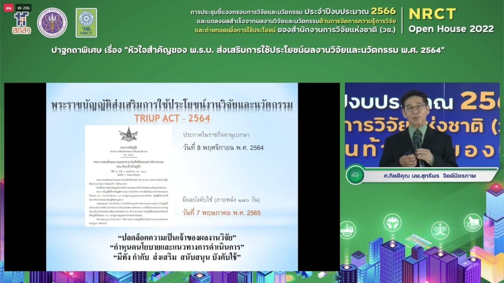 “พระราชบัญญัติส่งเสริมการใช้ประโยชน์ผลงานวิจัยและนวัตกรรม พ.ศ.2564 (TRIUP ACT) จะช่วยปลดล็อกความเป็นเจ้าของผลงานวิจัย ช่วยกำหนดนโยบายและแนวทางการดำเนินการ ทั้งด้านการกำกับดูแล ส่งเสริมและสนับสนุนการใช้ประโยชน์จากผลงานวิจัยและนวัตกรรม ซึ่ง พรบ. ดังกล่าว มีผลบังคับใช้แล้ว เมื่อวันที่ 7 พฤษภาคม 2565 ที่ผ่านมา” ศาสตราจารย์กิตติคุณ นายแพทย์สุทธิพร จิตต์มิตรภาพ ประธาน กสว. กล่าวทิ้งท้าย