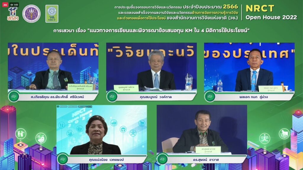 วันที่ 15 มิถุนายน 2565 สำนักงานการวิจัยแห่งชาติ (วช.) กระทรวงการอุดมศึกษา วิทยาศาสตร์ วิจัยและนวัตกรรม (อว.) จัดการประชุมชี้แจงกรอบการวิจัยและนวัตกรรมด้านการจัดการความรู้การวิจัยและถ่ายทอดเพื่อการใช้ประโยชน์ (KM) ประจำปีงบประมาณ 2566 และการแถลงผลสำเร็จจากผลงานวิจัยและนวัตกรรมด้านการจัดการความรู้การวิจัยและถ่ายทอดเพื่อการใช้ประโยชน์ NRCT Open House 2022 “วิจัยและนวัตกรรมในประเด็นท้าทายของประเทศ” เพื่อชี้แจงกรอบการวิจัยและนวัตกรรม ประจำปีงบประมาณ 2566 ของ (วช.) และแนวทางการเขียนและพิจารณาข้อเสนอการวิจัยและนวัตกรรม รวมทั้งแถลงผลสำเร็จจากการวิจัยและนวัตกรรม เพื่อเป็นเวทีแลกเปลี่ยนประสบการณ์การเขียนข้อเสนอการวิจัยและนวัตกรรมและการยื่นขอทุน (วช.) ด้านการจัดการความรู้การวิจัยและถ่ายทอดเพื่อการใช้ประโยชน์ โดย ดร.วิภารัตน์ ดีอ่อง ผู้อำนวยการสำนักงานการวิจัยแห่งชาติ (วช.) เป็นประธานเปิดการประชุมฯ