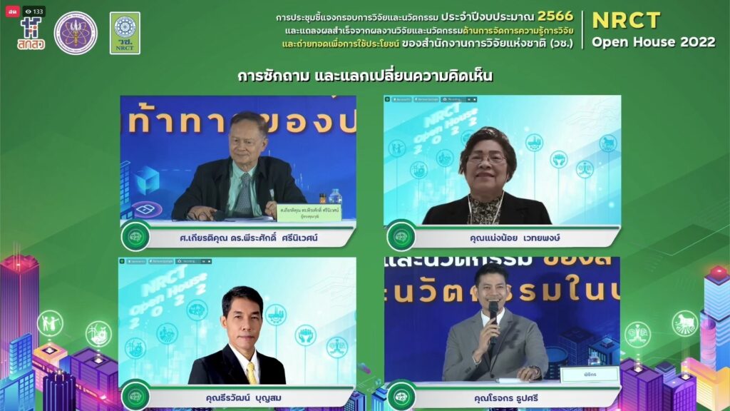 นอกจากนี้ยังมีการเสวนาเรื่อง “แนวทางการเขียนและพิจารณาข้อเสนอทุน KM ใน 4 มิติการใช้ประโยชน์” ผู้ร่วมเสวนาประกอบด้วยศาสตราจารย์เกียรติคุณ ดร.พีระศักดิ์ ศรีนิเวศน์,นายสมบูรณ์ วงค์กาด,พลเอก กนก ภู่ม่วง และนางแน่งน้อย เวทยพงษ์ โดยมี ดร.สุพจน์ อาวาส เป็นผู้ดำเนินรายการ การซักถามและแลกเปลี่ยนความคิดเห็น โดย ศาสตราจารย์เกียรติคุณ ดร.พีระศักดิ์ ศรีนิเวศน์,นางแน่งน้อย เวทยพงษ์ และนายธีรวัฒน์ บุญสม รวมถึงการนำเสนอวีดิทัศน์แนะนำการใช้งานระบบ NRIIS โดย นายเอนก บำรุงกิจ และปิดท้ายด้วยการแถลงผลสำเร็จจากผลงานวิจัยและนวัตกรรมด้านการจัดการความรู้การวิจัยและถ่ายทอดเพื่อการใช้ประโยชน์ และแลกเปลี่ยนประสบการณ์การเขียนข้อเสนอกิจกรรมส่งเสริมและสนับสนุนการวิจัยและนวัตกรรม โดย ดร.สุพจน์ อาวาส,ดร.มารยาท สมุทรสาคร,ดร.อันธิกา บุญแดง,ผู้ช่วยศาสตราจารย์ ดร.พีรวัฒน์ ปลาเงิน,รองศาสตราจารย์ ดร.ปานใจ ธารทัศนวงศ์ และนายวรพจน์ โพธาเจริญ โดยกิจกรรม NRCT Open House2022 : ด้านการจัดการความรู้การวิจัยและถ่ายทอดเพื่อการใช้ประโยชน์ การออกแบบความรู้ที่เป็นนวัตกรรมพร้อมใช้ เทคโนโลยีที่เหมาะสม เพื่อนำไปใช้ในกระบวนการวิจัยเพื่อแก้ไขปัญหาสำคัญ เสริมศักยภาพได้อย่างเป็นรูปธรรมผ่านการสร้างนวัตกรรมชุมชนที่เป็นผู้นำการเปลี่ยนแปลงในการรับและปรับใช้นวัตกรรมพร้อมใช้เทคโนโลยีที่เหมาะสมกับบริบท สามารถถ่ายทอดความรู้ไปสู่ผู้อื่นได้รวมทั้งสามารถเป็นแกนนำในการจัดกระบวนการเรียนรู้เพื่อหนุนให้ชุมชนมีพื้นที่และโอกาสเรียนรู้ได้อย่างต่อเนื่องและยั่งยืน