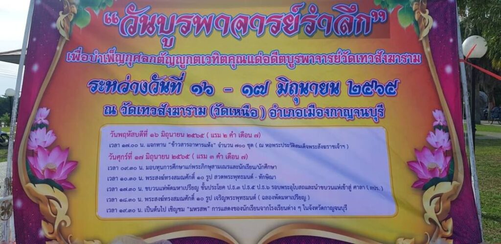 (16 มิ.ย.65) เวลา 17.00 น. หลวงพ่อเพิ่ม เจ้าอาวาสวัดเทวสังฆาราม (วัดเหนือ) พร้อมด้วย นายกเทศบาลตำบลปากแพรก คณะผู้บริหารเทศบาลเมืองกาญจนบุรี แจกข้าวสารอาหารแห้งให้กับประชาชน เนื่องใน “วันบูรพาจารย์รำลึก” ระหว่างวันที่ 16-17 มิถุนายน 2565 ประชาชน จำนวนมากเข้าแถวรับกันอย่างคึกคัก