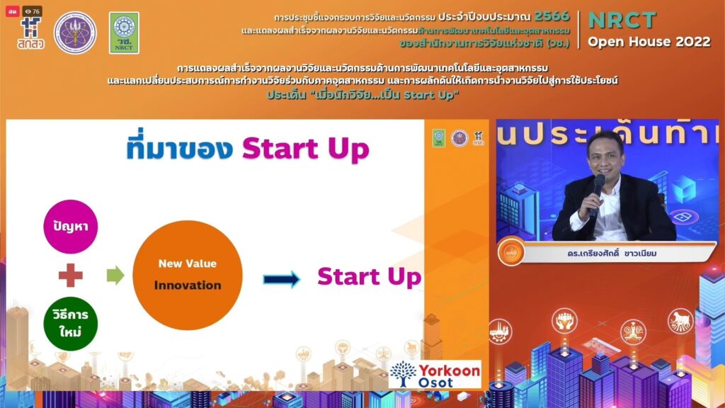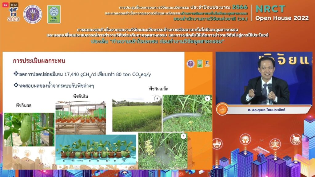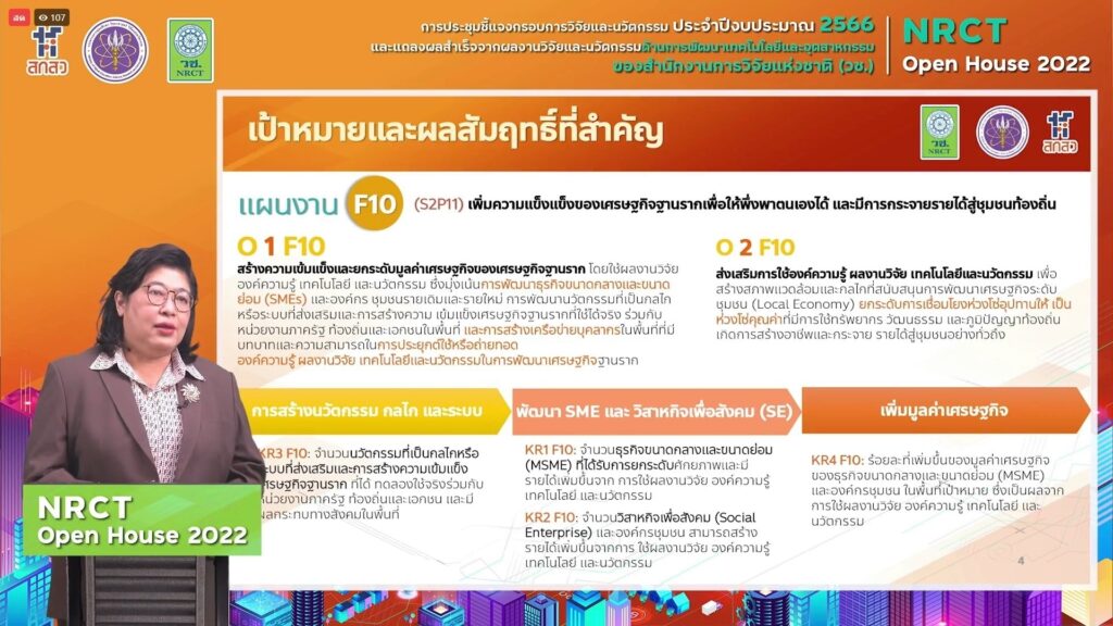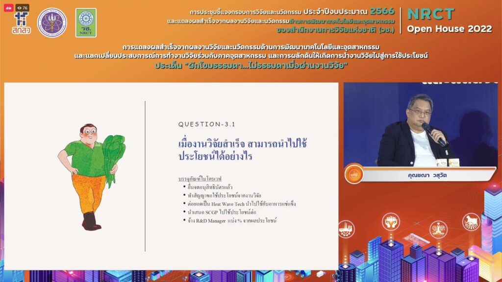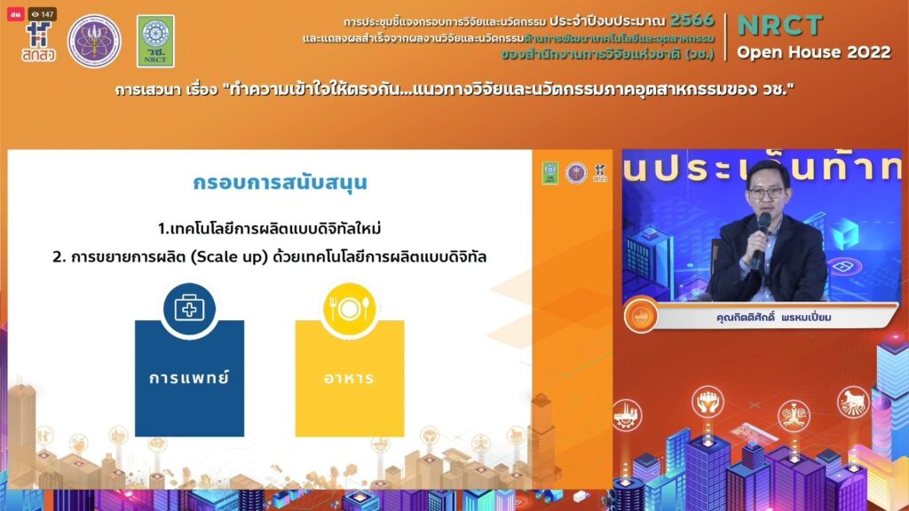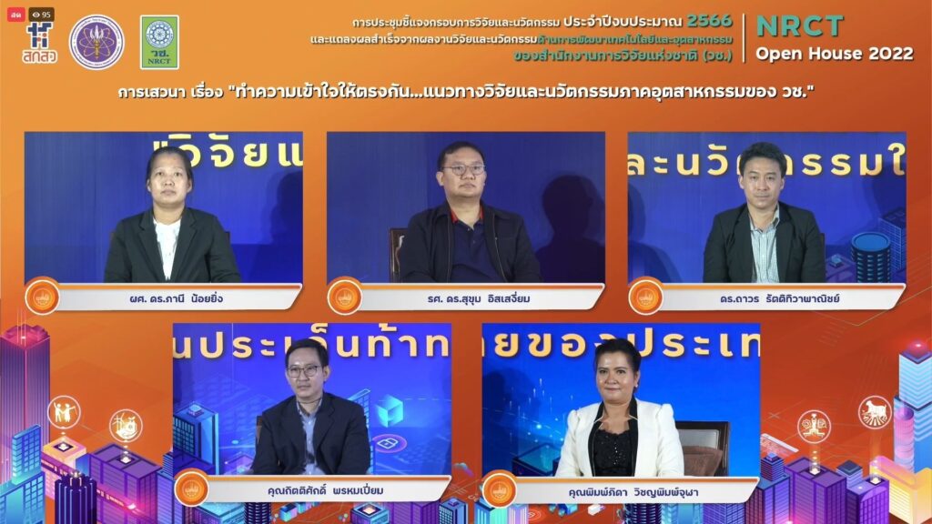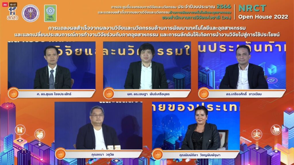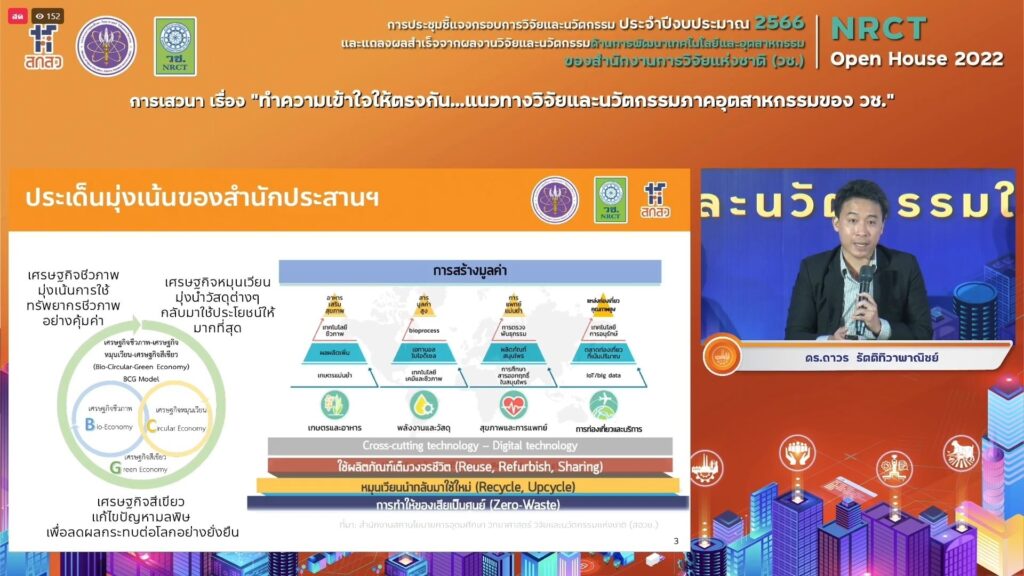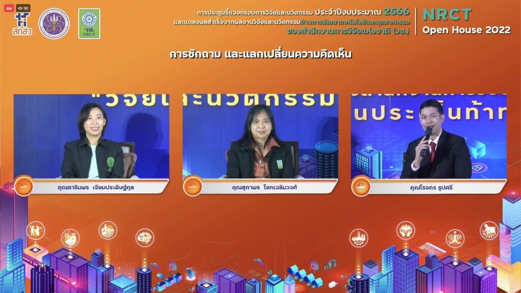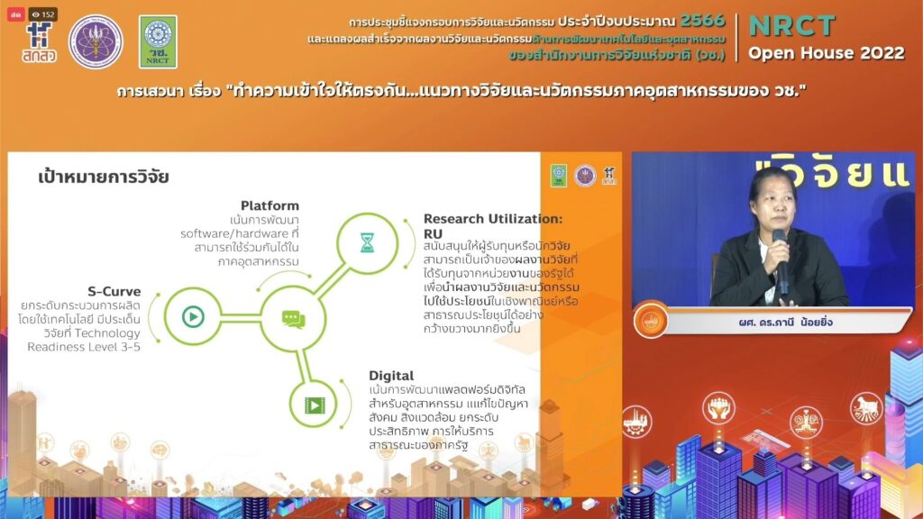 ดร.วิภารัตน์ ดีอ่อง ผู้อำนวยการสำนักงานการวิจัยแห่งชาติ (วช.) กล่าวว่า (วช.) ภายใต้กระทรวง (อว.) ได้จัดการประชุมชี้แจงกรอบการวิจัยและนวัตกรรม NRCT Open House 2022 และการแถลงผลสำเร็จจากผลงานวิจัยและนวัตกรรมด้านการพัฒนาเทคโนโลยีและอุตสาหกรรม วันนี้จัดขึ้นเป็นวันที่ห้าแล้ว เป็นการประชุม ในสถานการณ์ปัจจุบัน เทรนด์เทคโนโลยีทางอุตสาหกรรมตามกระแสโลก แบ่งได้เป็น อุตสาหกรรมเศรษฐกิจดิจิทัล และอุตสาหกรรมเฉพาะ เมื่อนำมาเชื่อมเข้ากับแผนงานที่เกี่ยวข้องกับยุทธศาสตร์ (ววน.) ในการส้รางโอกาสเพิ่มมูลค่าทางเศรษฐกิจ และการใช้ความรู้จากงานวิจัย เทคโนโลยี และนวัตกรรม เพื่อเพิ่มความเข้มแข็งและยกระดับมูลค่าทางเศรษฐกิจของเศรษฐกิจฐานรากเพื่อให้สามารถพึ่งพาตนเองได้ และมีการกระจายรายได้สู่ชุมชนท้องถิ่น รวมถึงการพัฒนา SME และวิสาหกิจเพื่อสังคม