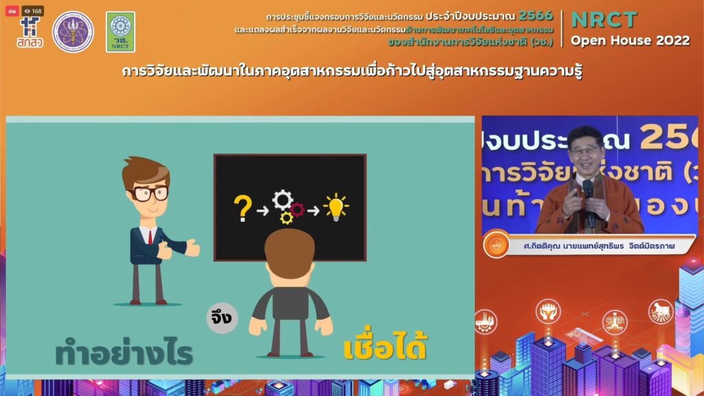 ภายในงานมีการบรรยายพิเศษ เรื่อง “การวิจัยและพัฒนาในภาคอุตสาหกรรมเพื่อก้าวไปสู่อุตสาหกรรมฐานความรู้” โดย ศ.(กิตติคุณ) นพ.สุทธิพร จิตต์มิตรภาพ ประธานกรรมการส่งเสริมวิทยาศาสตร์ วิจัยและนวัตกรรม (กสว.) กล่าวว่า จากงานวิจัยที่พัฒนาไปถึงระดับ 4 และระดับ 5 ทำอย่างไร จึงจะผลิตได้ ซึ่งในการผลิตจะต้องมีองค์ความรู้ในกระบวนการทางวิศวกรรม มีผู้เชี่ยวชาญที่สามารถให้คำแนะนำได้ ตั้งแต่ต้นน้ำ กลางน้ำ และปลายน้ำ เพื่อให้มั่นใจได้ว่าลงทุนไปแล้วจะไม่สูญเปล่า รวมถึงการอ้างอิงงานวิจัยต่างๆ ซึ่งงานวิจัยนั้น ต้องได้รับการรับรองมาแล้ว มีความน่าเชื่อถือ และมีเงื่อนไขกำหนดเวลาที่ชัดเจน เมื่อผลิตสินค้าออกมาได้แล้ว การจะขายสินค้าได้หรือไม่นั้น คือ สินค้าต้องมีมาตรฐาน มีรูปลักษณ์ที่ดึงดูดใจของลูกค้า สินค้าต้องตอบโจทย์ความต้องการของผู้บริโภค ที่สำคัญคือ ต้องมีกลยุทธ์วางแผนการตลาดที่ดี ซึ่งสิ่งเหล่านี้จะสามารถทำให้งานวิจัยก้าวไปสู่อุตสาหกรรมฐานความรู้ได้