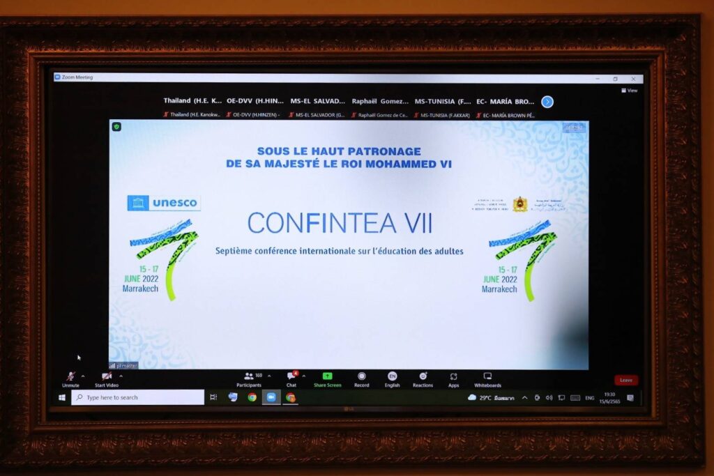 เมื่อวันที่ 15 มิถุนายน 2565 เวลา 19.15 น. : นางกนกวรรณ วิลาวัลย์ รัฐมนตรีช่วยว่าการกระทรวงศึกษาธิการ ร่วมนำเสนอในการประชุมด้านการศึกษาผู้ใหญ่ ครั้งที่ 7 หรือ Seventh International Conference on Adult Education (CONFINTEA VII) ซึ่งจัดขึ้นระหว่างวันที่ 15-17 มิถุนายน 2565 ในรูปแบบผสมผสาน (Hybrid) ทั้งการประชุมทางไกล ผ่านระบบ Zoom และการประชุมในสถานที่ ณ เมืองมาราเกซ ราชอาณาจักรโมร็อกโก โดยมี นายกมล รอดคล้าย ที่ปรึกษา รมช.ศึกษาธิการ,นายสุภัทร จำปาทอง ปลัดกระทรวงศึกษาธิการ,นางสาวดุริยา อมตวิวัฒน์ ที่ปรึกษาด้านความร่วมมือกับต่างประเทศ และนางสาวทรงศรี วิระรังษิยากรณ์ รองเลขาธิการ กศน.เข้าร่วมประชุม ที่ ห้องประชุมจันทรเกษม ซึ่งมีหลายประเทศร่วมนำเสนอ อาทิ ราชอาณาจักรโมร็อกโก,ไอเวอร์รีโคส,ญี่ปุ่น,สโลวีเนีย,เอกวาดอร์,อาร์เจนตินา และ สวีเดน เป็นต้น