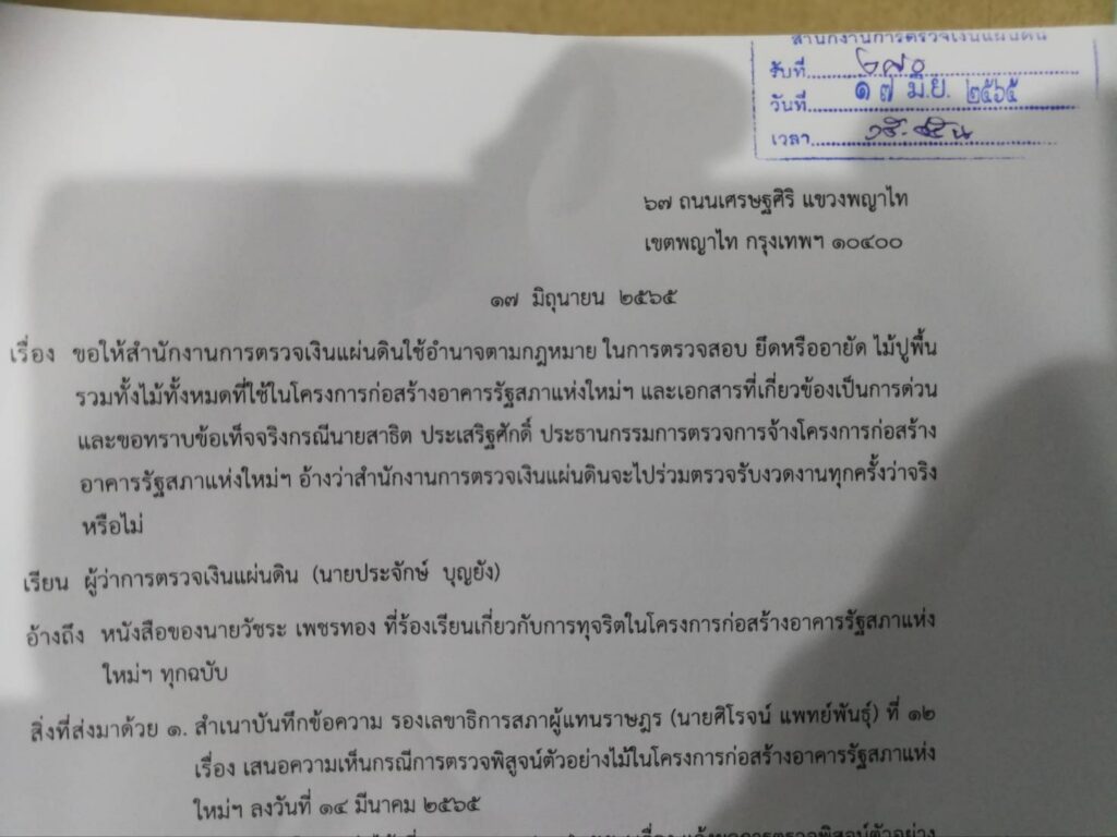 (17 มิ.ย.65)เมื่อเวลา 15.45 น.ที่สำนักงานการตรวจเงินแผ่นดิน (สตง.)นายวัชระ เพชรทอง อดีตส.ส.พรรคประชาธิปัตย์ ยื่นหนังสือถึงนายประจักษ์ บุญยัง ผู้ว่าการตรวจเงินแผ่นดิน ขอให้ตรวจสอบ ยึดหรืออายัด ไม้ปูพื้น รวมทั้งไม้ทั้งหมดที่ใช้ในโครงการก่อสร้างอาคารรัฐสภาแห่งใหม่และเอกสารที่เกี่ยวข้องเป็นการด่วน รวมทั้งขอทราบข้อเท็จจริงกรณีนายสาธิต ประเสริฐศักดิ์ ประธานกรรมการตรวจการจ้างโครงการก่อสร้างอาคารรัฐสภาแห่งใหม่ อ้างว่าสตง.จะไปร่วมตรวจรับงวดงานทุกครั้งว่าจริงหรือไม่
