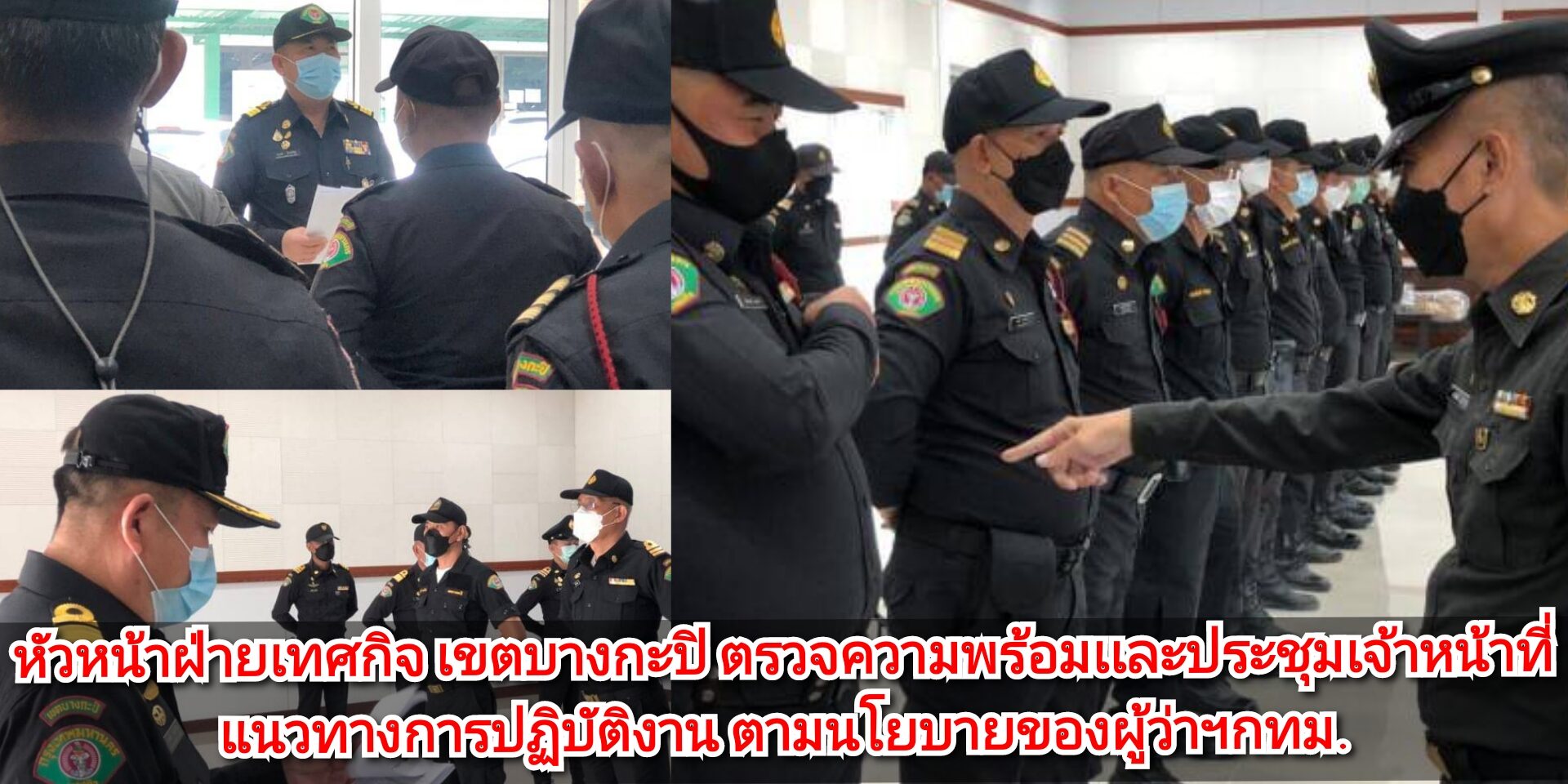 เมื่อวันศุกร์ที่ 17 มิถุนายน 2565 ผ่านมา เวลา 13.30 น. นายนพ ชูสอน ผู้อำนวยการเขตบางกะปิ มอบหมายให้นายวรรณชัย น้อมภักดีกุล หัวหน้าฝ่ายเทศกิจ เรียกประชุมข้าราชการและบุคลากร ฝ่ายเทศกิจ เพื่อตรวจเครื่องแต่งกายและความเรียบร้อยของเจ้าหน้าที่ พร้อมแจ้งข้อราชการและแนวทางการปฏิบัติตามนโยบายของผู้ว่าราชการกรุงเทพมหานคร ดังนี้