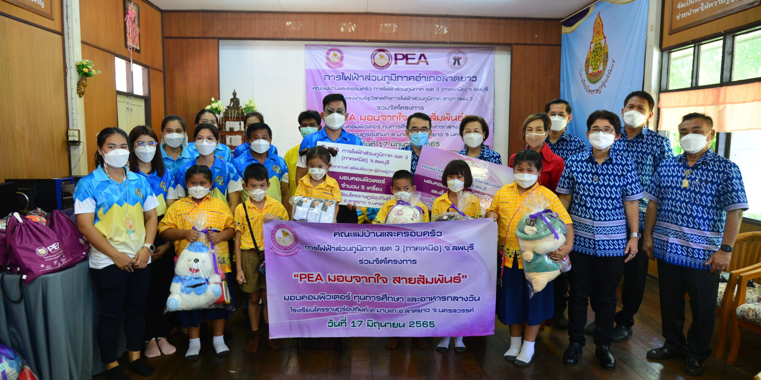 เมื่อวันที่ 17 มิ.ย.65 นายสงกรานต์ ชุติธนธีระกุล ผู้ช่วยผู้ว่าการ การไฟฟ้าส่วนภูมิภาค เขต 3 (ภาคเหนือ) จ.ลพบุรี พร้อมด้วยนางสายปัญญา ชุติธนธีระกุล ประธานคณะแม่บ้านและครอบครัวการไฟฟ้าส่วนภูมิภาค เขต 3 (ภาคเหนือ) จ.ลพบุรี นายธรรมนูญ สุวรรณพฤกษ์ ผอ.ฝ่ายบัญชีและพลังงานไฟฟ้า นายศิริชัย เงินงอก ผจก.กฟภ.จ.นครสวรรค์ นายยุทธนา ร่มจำปา ผจก.กฟภ.อ.ลาดยาวและพนักงาน ร่วมกันจัดกิจกรรม โครงการ “PEA มอบจากใจ สายสัมพันธ์” ด้วยการมอบคอมพิวเตอร์ และอุปกรณ์ประกอบจำนวน 5 เครื่อง อุปกรณ์กีฬา ทุนการศึกษา และเลี้ยงอาหารกลางวัน ให้แก่นักเรียนโรงเรียนไตรราษฎร์อุปถัมภ์ ต.มาบแก อ.ลาดยาว จ.นครสวรรค์ เพื่อส่งเสริมสนับสนุนพัฒนากระบวนการเรียนรู้ ตลอดจนค้นคว้าข้อมูลจากสื่อออนไลน์ของนักเรียน โดยมี นายจีรพงศ์ พิฤกษ์ ผู้อำนวยการ คณะครูและนักเรียน คณะกรรมการสถานศึกษาให้การต้อนรับ นอกจากนี้ น.ส.แก้วตา มะระยงค์ เลขานุการนายกองค์การบริหารส่วนจังหวัดนครสวรรค์ ตัวแทนนายนิโรธ สุนทรเลขา ประธานวิปรัฐบาลและกรรมาธิการตำรวจ ยังร่วมมอบทุนทรัพย์ในกิจกรรมครั้งนี้อีกด้วย ซึ่งบรรยากาศเป็นไปด้วยความสุขของนักเรียนและคณะครู