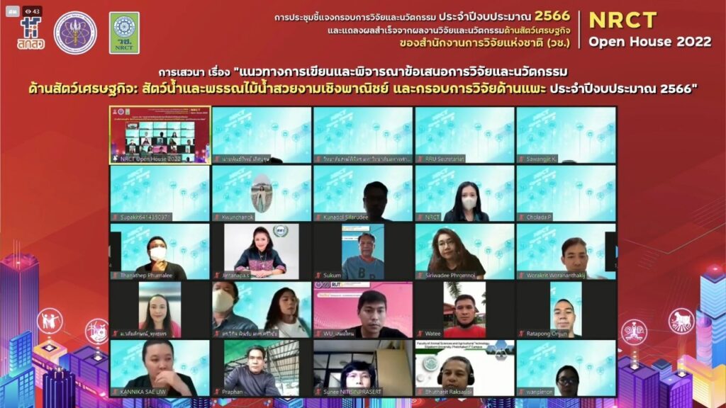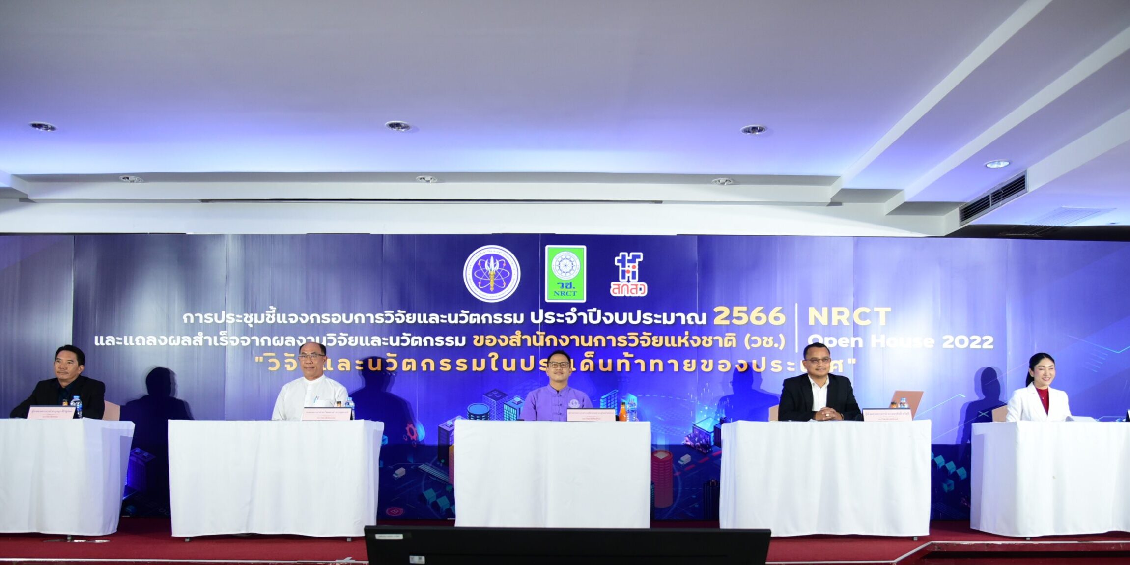 วันที่ 19 มิถุนายน 2565 สำนักงานการวิจัยแห่งชาติ (วช.) กระทรวงการอุดมศึกษา วิทยาศาสตร์ วิจัยและนวัตกรรม (อว.) จัดการประชุมชี้แจงกรอบการวิจัยและนวัตกรรมประจำปีงบประมาณ 2566 การแถลงผลสำเร็จจากผลงานวิจัยและนวัตกรรม และแนวทางการเขียนและพิจารณาข้อเสนอการวิจัยและนวัตกรรม ด้านสัตว์เศรษฐกิจ NRCT Open House 2022 “วิจัยและนวัตกรรมในประเด็นท้าทายของประเทศ” เพื่อเป็นเวทีแลกเปลี่ยนประสบการณ์การเขียนข้อเสนอการวิจัยและนวัตกรรมและการยื่นขอทุน (วช.) ด้านสัตว์เศรษฐกิจ โดยมี ดร.วิภารัตน์ ดีอ่อง ผู้อำนวยการสำนักงานการวิจัยแห่งชาติ (วช.) เป็นประธานเปิดการประชุม ณ ห้องประชุมจอมพลสฤษดิ์ ธนะรัชต์ ชั้น 2 อาคาร วช.1 สำนักงานการวิจัยแห่งชาติ และออนไลน์ผ่านระบบ Zoom รวมทั้งการถ่ายทอดสด (Live Steaming) ผ่าน Facebook ของสำนักงานการวิจัยแห่งชาติ