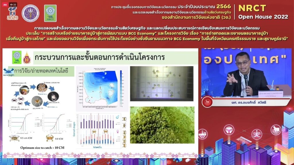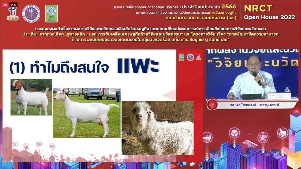 ดร.วิภารัตน์ ดีอ่อง ผู้อำนวยการสำนักงานการวิจัยแห่งชาติ (วช.) กล่าวว่า (วช.) ภายใต้กระทรวง (อว.) ได้จัด การประชุมชี้แจงกรอบการวิจัยและนวัตกรรม ประจำปีงบประมาณ 2566 การแถลงผลสำเร็จจากผลงานวิจัยและนวัตกรรม และแนวทางการเขียนและพิจารณาข้อเสนอการวิจัยและนวัตกรรม ในวันนี้จัดขึ้นเป็นวันที่แปด ปิดท้ายงาน NRCT Open House 2022 ด้วยการประชุมด้านสัตว์เศรษฐกิจ ปัจจุบันได้มีการนำระบบ (ววน.) เข้ามาส่งเสริมและสนับสนุนอาชีพทางเลือกหรืออาชีพเสริมให้แก่เกษตรกรด้วยสัตว์เศรษฐกิจ โดย (วช.) ได้ให้การสนับสนุนเกษตรกรในการคัดเลือกสัตว์เศรษฐกิจตัวใหม่ ๆ ที่มีโอกาสในการแข่งขันและมีต้นทุนไม่สูงมาก อาทิ ไก่พื้นเมือง จิ้งหรีด ปลาสวยงาม หรือ แพะ รวมถึง ปูม้า ซึ่งสร้างมูลค่า สร้างรายได้ให้กับเกษตรกรอย่างมาก ซึ่งในช่วง 2–3 ปีที่ผ่านมา (วช.) ยังคงสนับสนุนในการขยายผลจากนำงานวิจัยและนวัตกรรมมาช่วยในการสร้างอาชีพ สร้างรายได้ให้กับชุมชน ด้วยการขับเคลื่อนตามแนวทาง BCG โดยส่วนของสัตว์เศรษฐกิจที่ (วช.) ดูแล ได้ขับเคลื่อนโครงการตามยุทธศาสตร์ (ววน.) ซึ่งมีเป้าหมายและผลสัมฤทธิ์ที่จะช่วยขจัดความยากจน ลดความเหลื่อมล้ำโดยการลดช่องว่างของการเข้าถึงโอกาสด้านการพัฒนาอาชีพ การสร้างความเข้มแข็งและยกระดับมูลค่าเศรษฐกิจของเศรษฐกิจฐานราก ส่งเสริมองค์ความรู้ผลงานวิจัย เทคโนโลยี และนวัตกรรม ซึ่งมุ่งเน้นการพัฒนาในกลุ่มผู้ประกอบการ SMEs และในปี 2566 (วช.) จะเปิดรับข้อเสนอการวิจัยและนวัตกรรม ด้านสัตว์เศรษฐกิจใน 2 กลุ่มเรื่องที่สำคัญ ได้แก่ กลุ่มเรื่องสัตว์น้ำและพรรณไม้น้ำสวยงาม และกลุ่มเรืองแพะ ซึ่งจะมุ่งเน้นในเชิงพาณิชย์